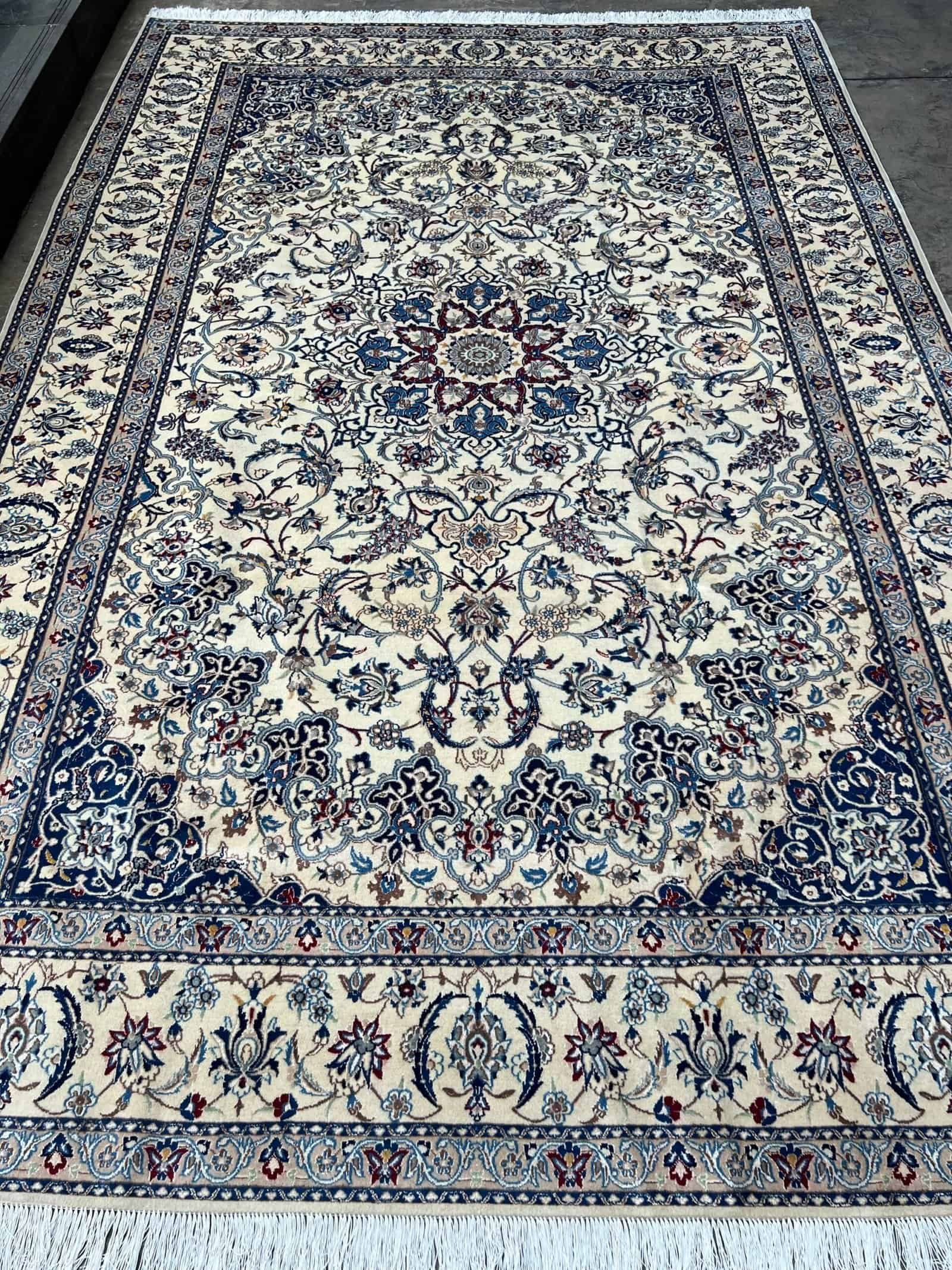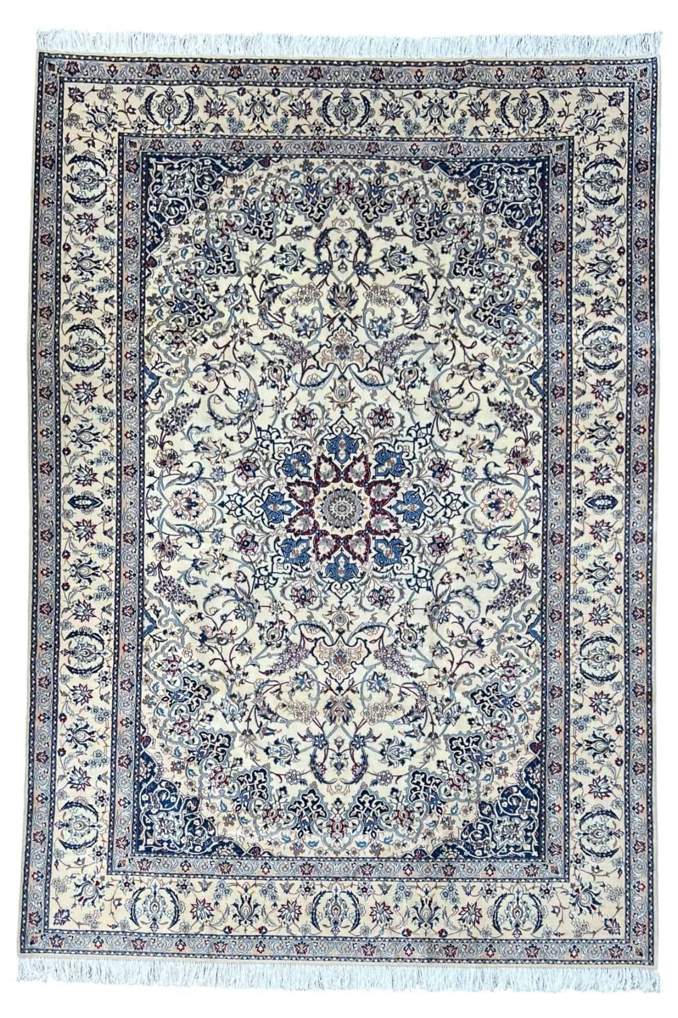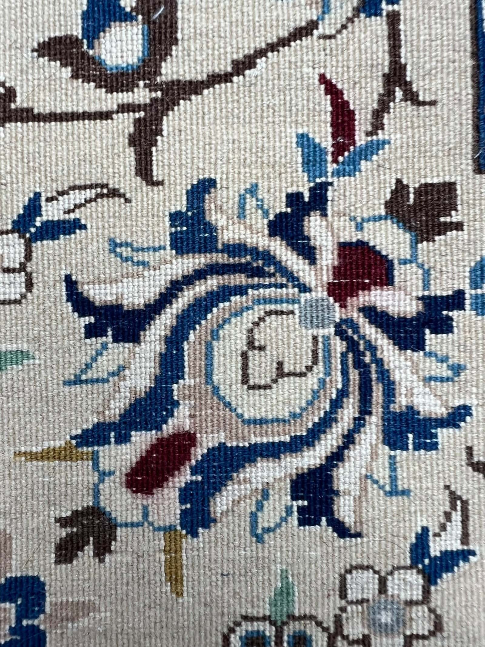 A fine Nain 9La rug from the 1990s, hand-knotted in Iran using soft wool and silk. Featuring classic floral motifs and a calm ivory-blue palette, it blends timeless elegance with fine craftsmanship — ideal for both traditional and modern spaces.