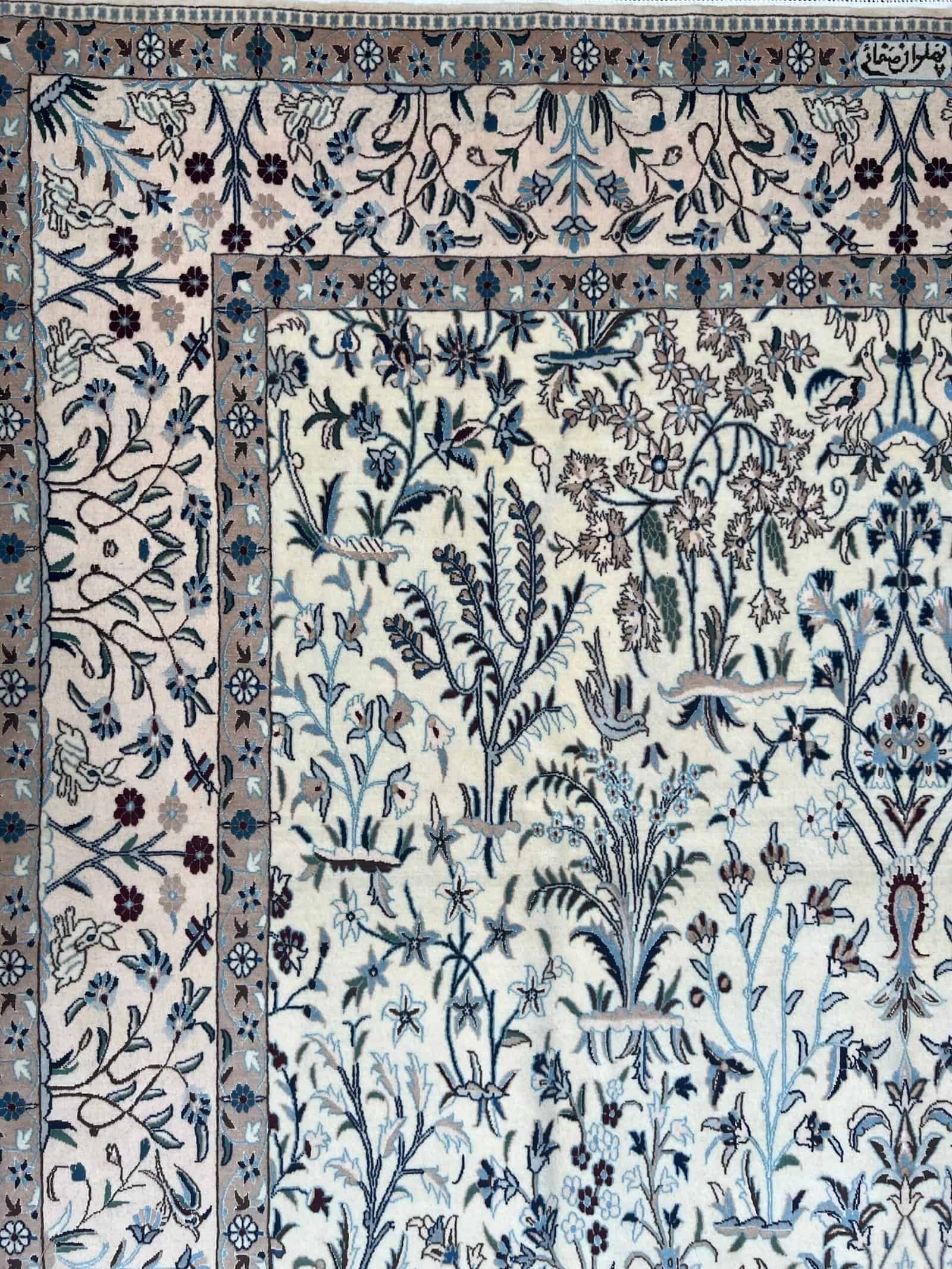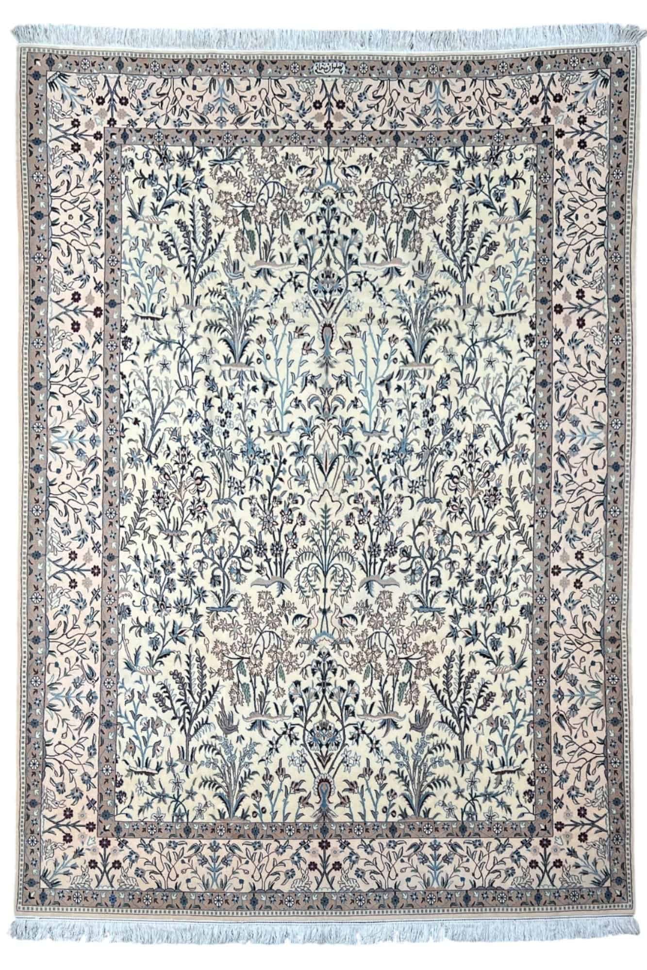 An exceptional Nain 6La masterpiece, finely knotted in wool and silk and signed by master weaver Pahlavan Safa. Featuring the timeless Garden of Eden design, this rug showcases extraordinary detail, harmony, and elegance—blending Persian artistry with spiritual symbolism. A true collector’s piece woven to perfection.