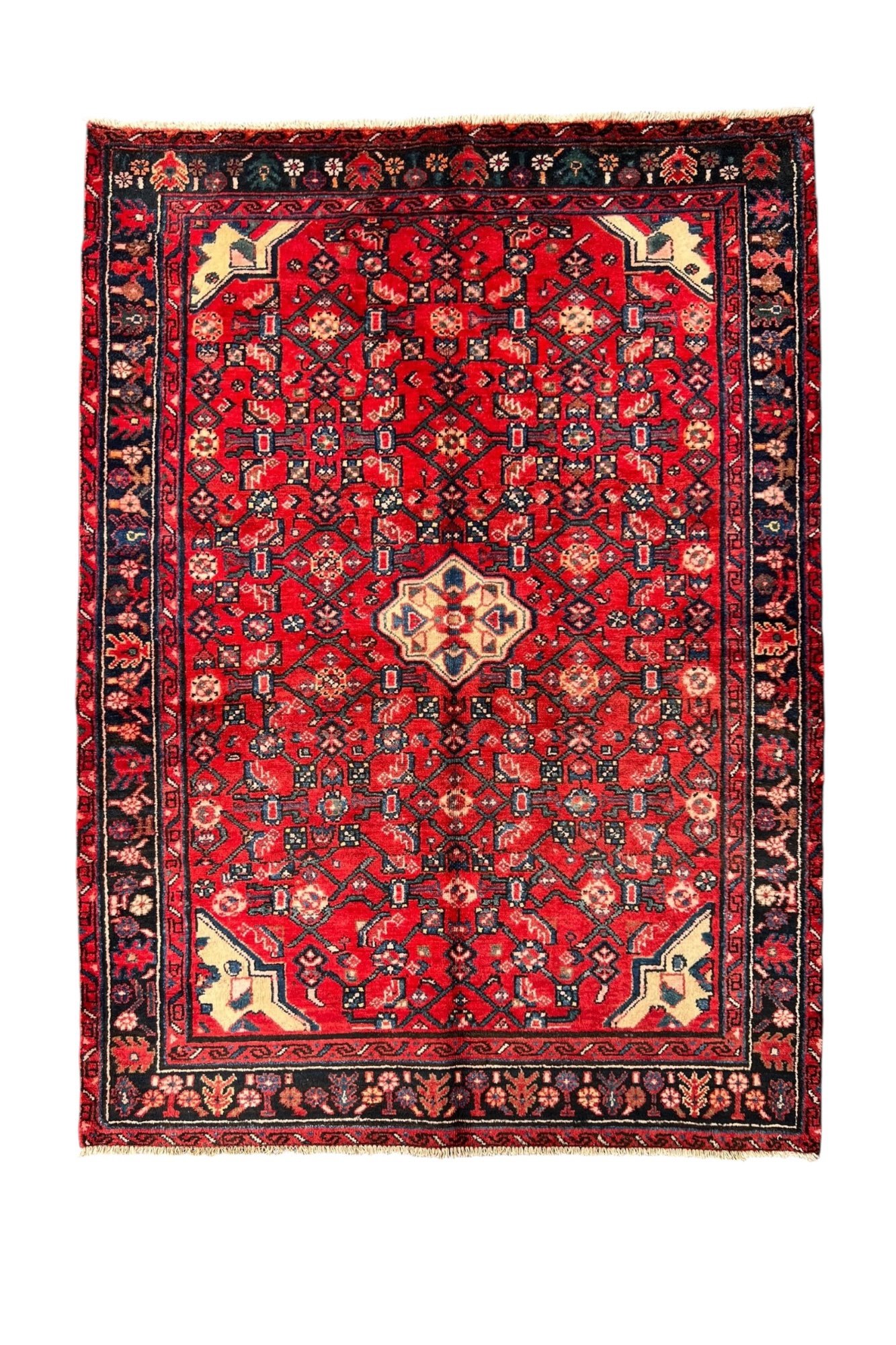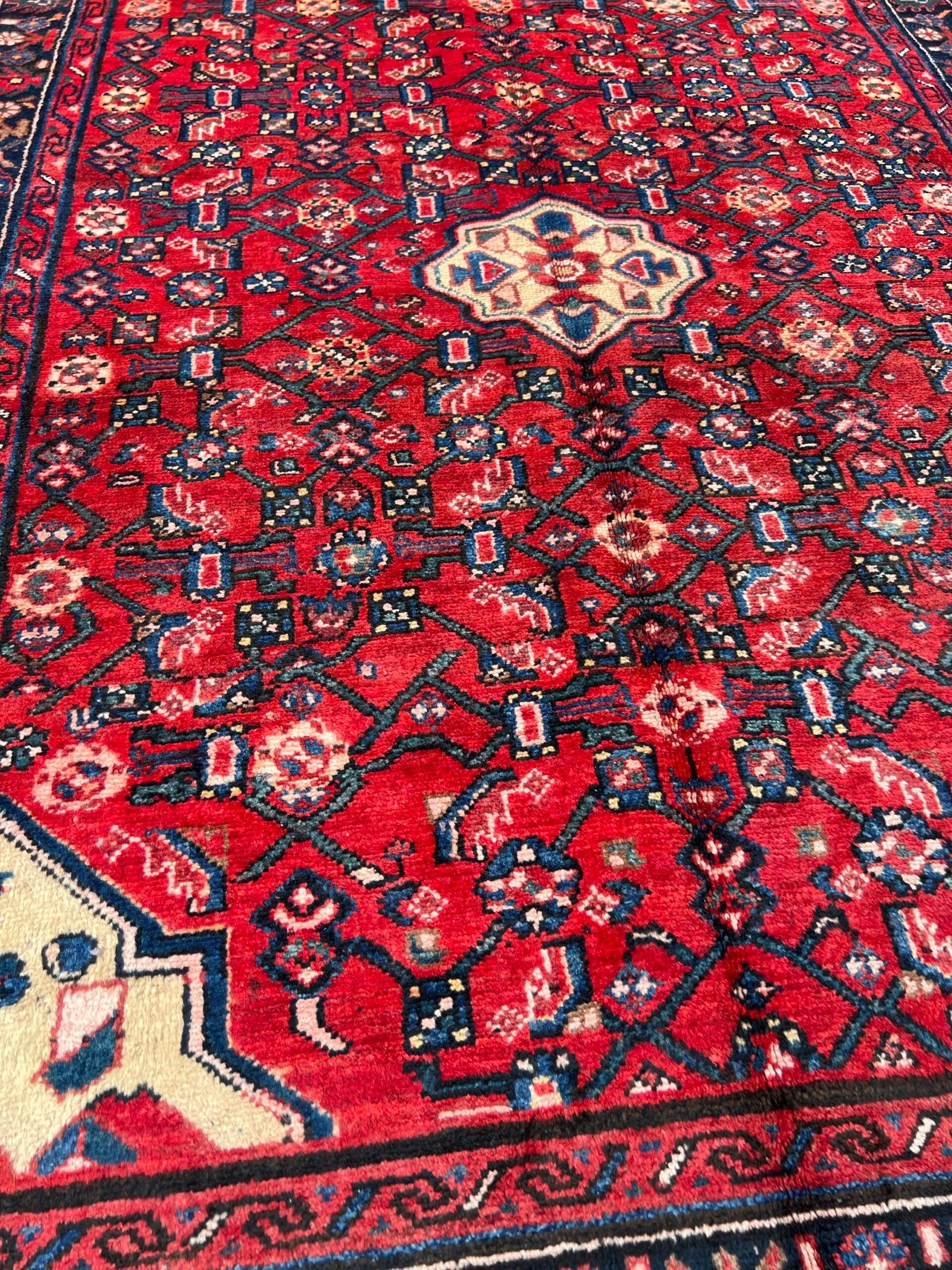 Handmade Hamedan rug from the 1980s, featuring traditional Persian patterns and a durable wool pile. Timeless design and warm tones make it perfect for any living space.