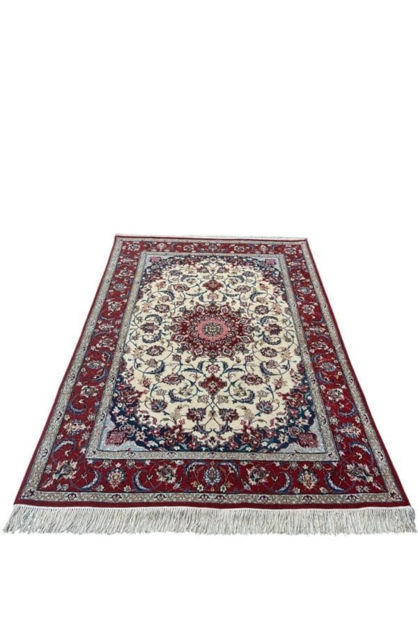 This exquisite Esfahan carpet, hand-knotted in the 1980s, features the delicate Tak Kheft technique knotted in luxurious silk. Signed by the renowned master weaver Entshari, it exemplifies exceptional craftsmanship and artistic precision. The intricate motifs and rich silk texture bring timeless elegance and a refined touch to any interior, making this carpet a prized collector’s piece.