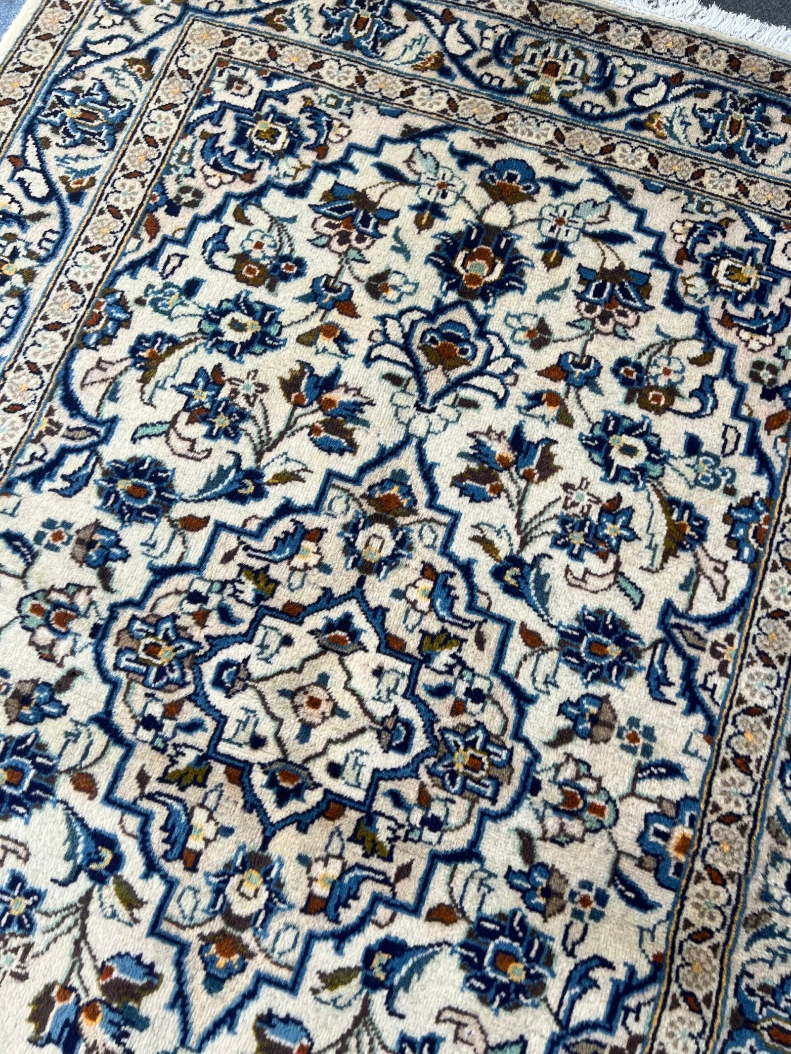 Classic Kashan rug in soft beige tones, handwoven from premium wool. Its dense pile and fine craftsmanship make it both durable and luxurious, adding warmth, texture, and timeless elegance to any room.