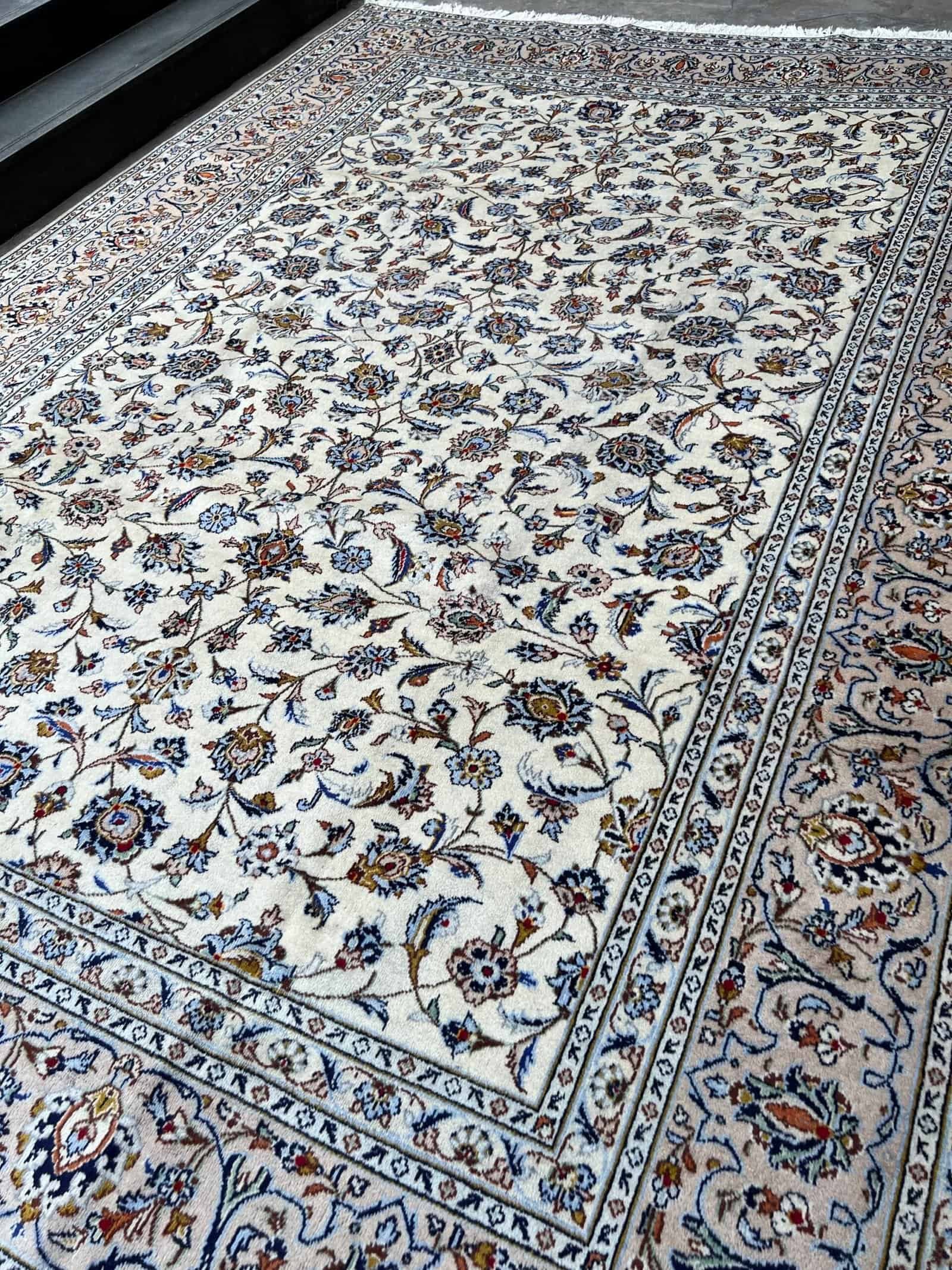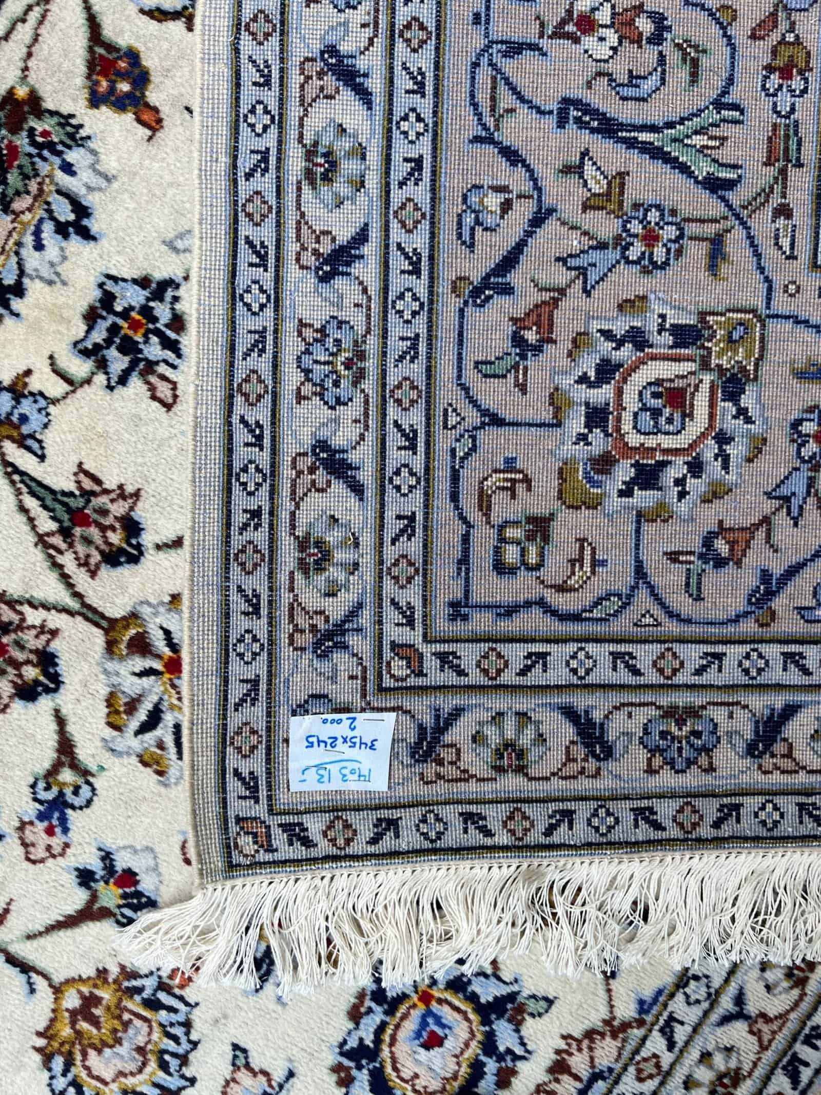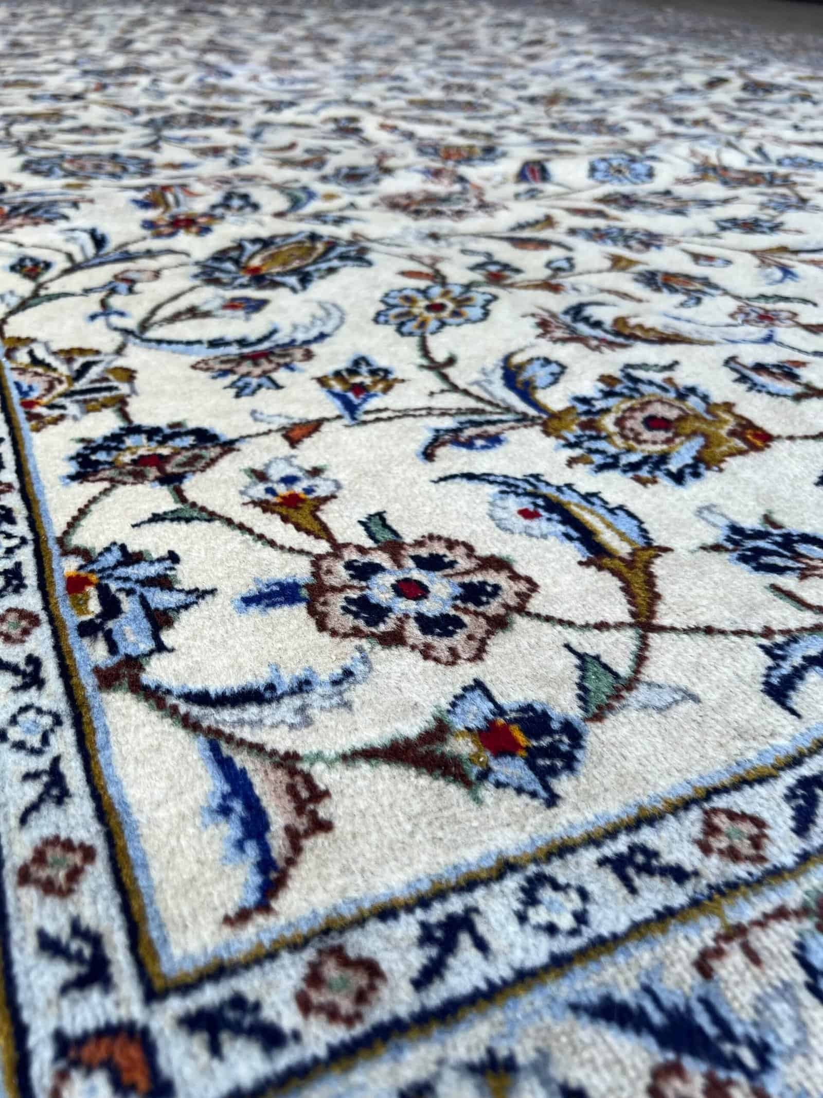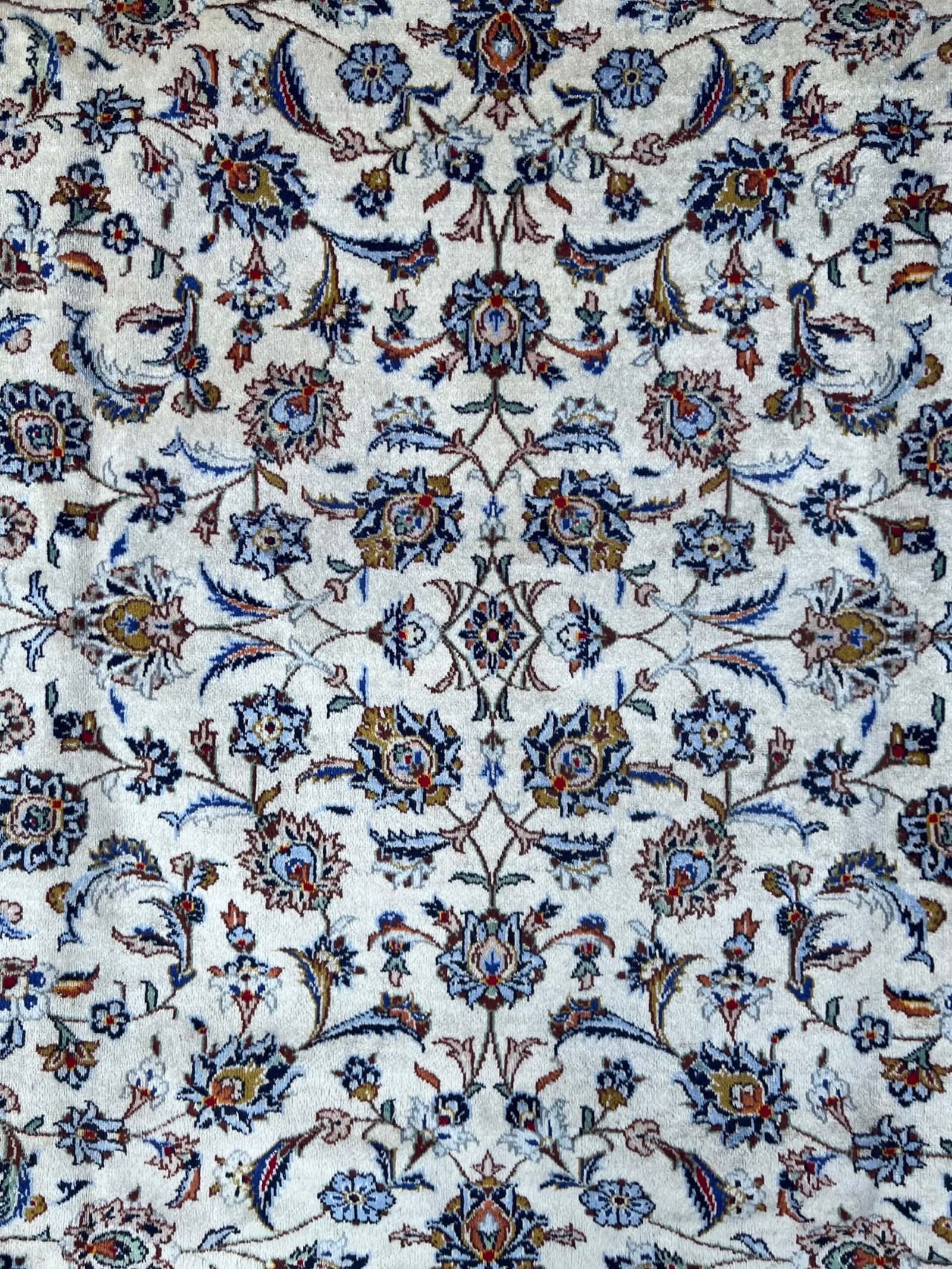 This Kashan carpet features the iconic Afshan design—an all-over floral pattern that flows gracefully across the surface without a central medallion. Hand-knotted in the renowned weaving centers of Kashan, this piece is made with fine wool and cotton, offering durability and beauty in one. Its balanced layout, detailed motifs, and soft palette make it a perfect fit for both traditional and modern interiors seeking a refined Persian touch.