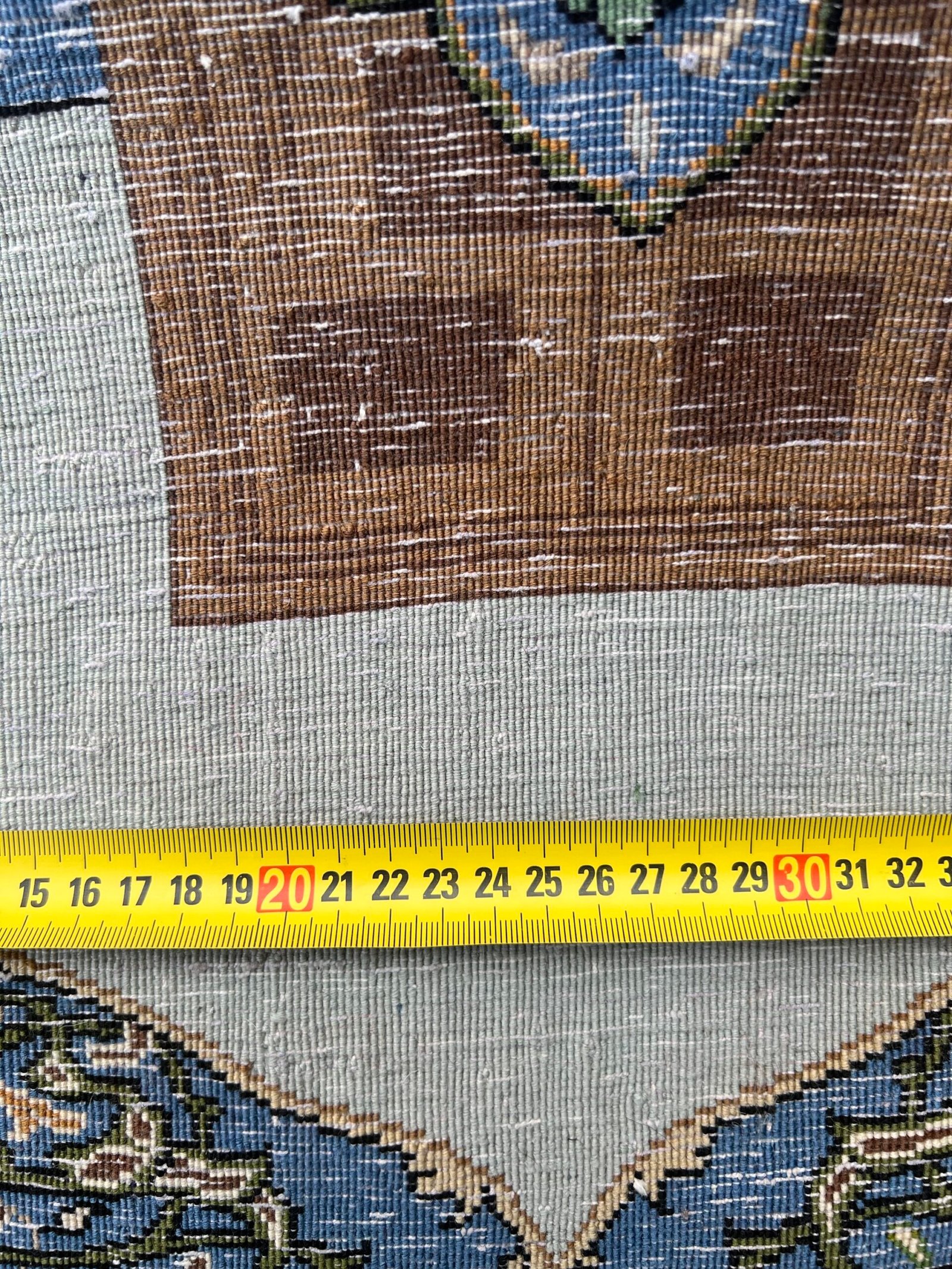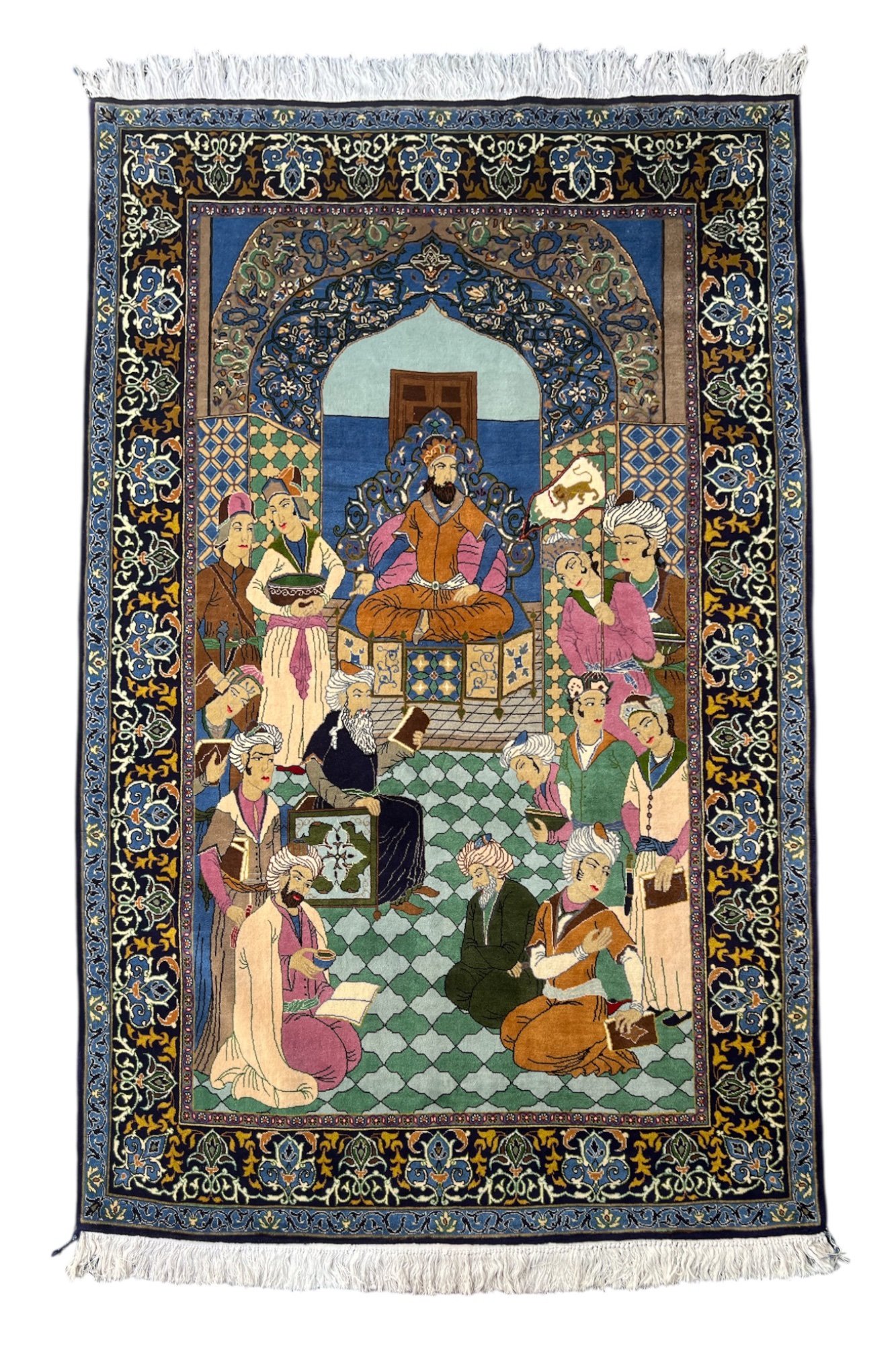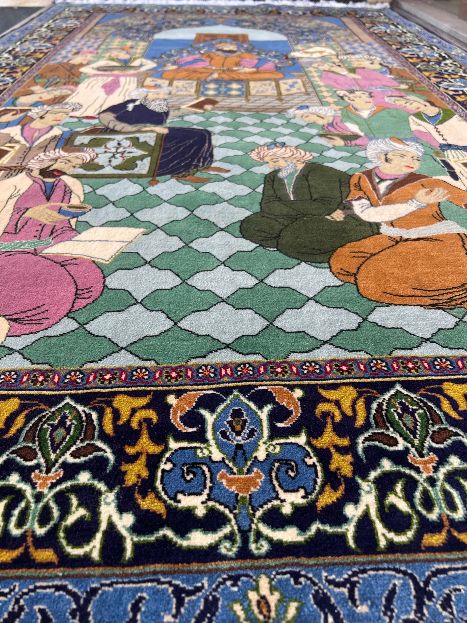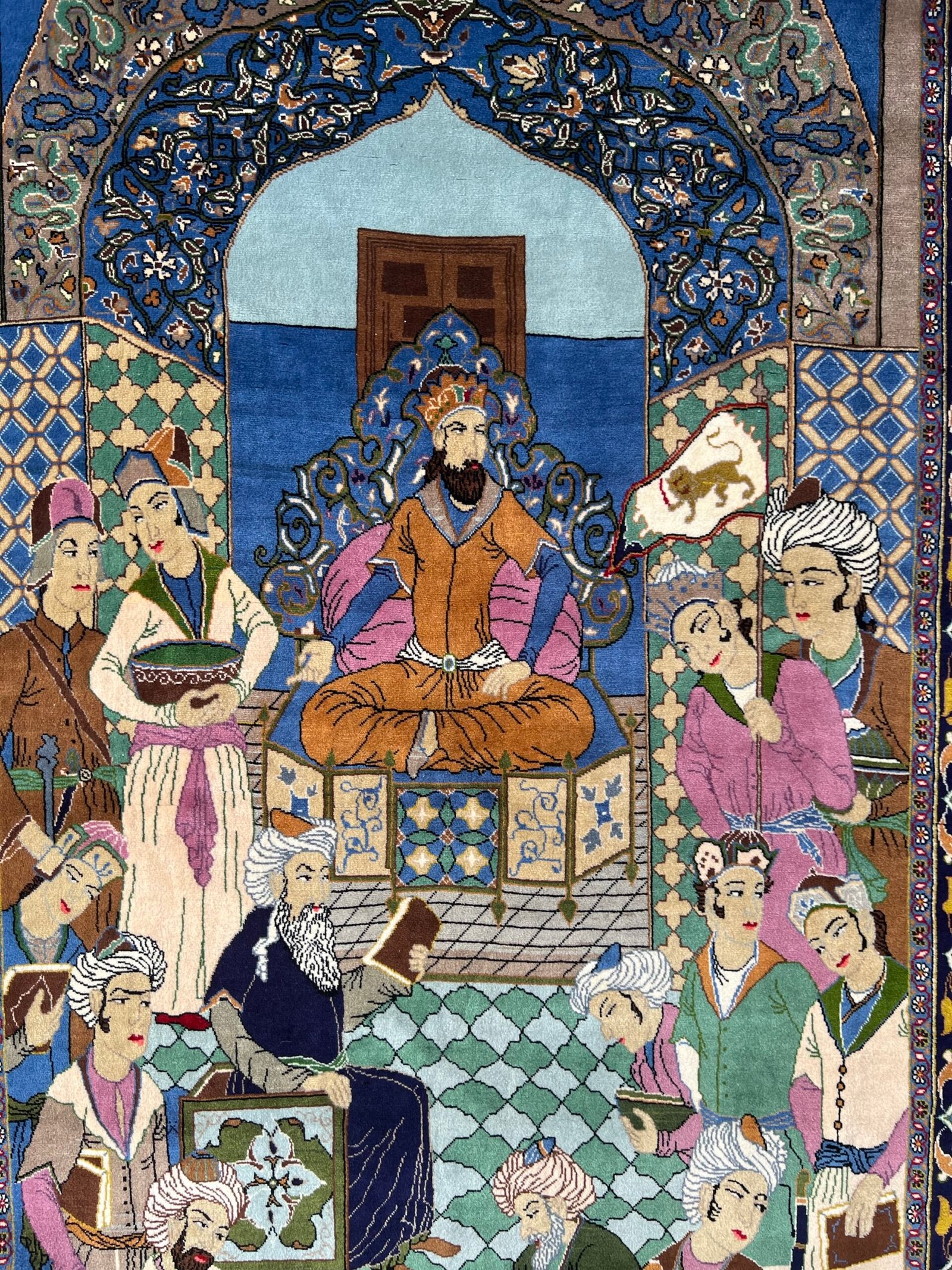 This masterpiece captures the essence of Persian grandeur: scholars and courtiers gathered around the throne, surrounded by intricate floral borders and balanced symmetry. The soft kork wool gives a natural sheen and luxurious texture, bringing depth and life to every thread.