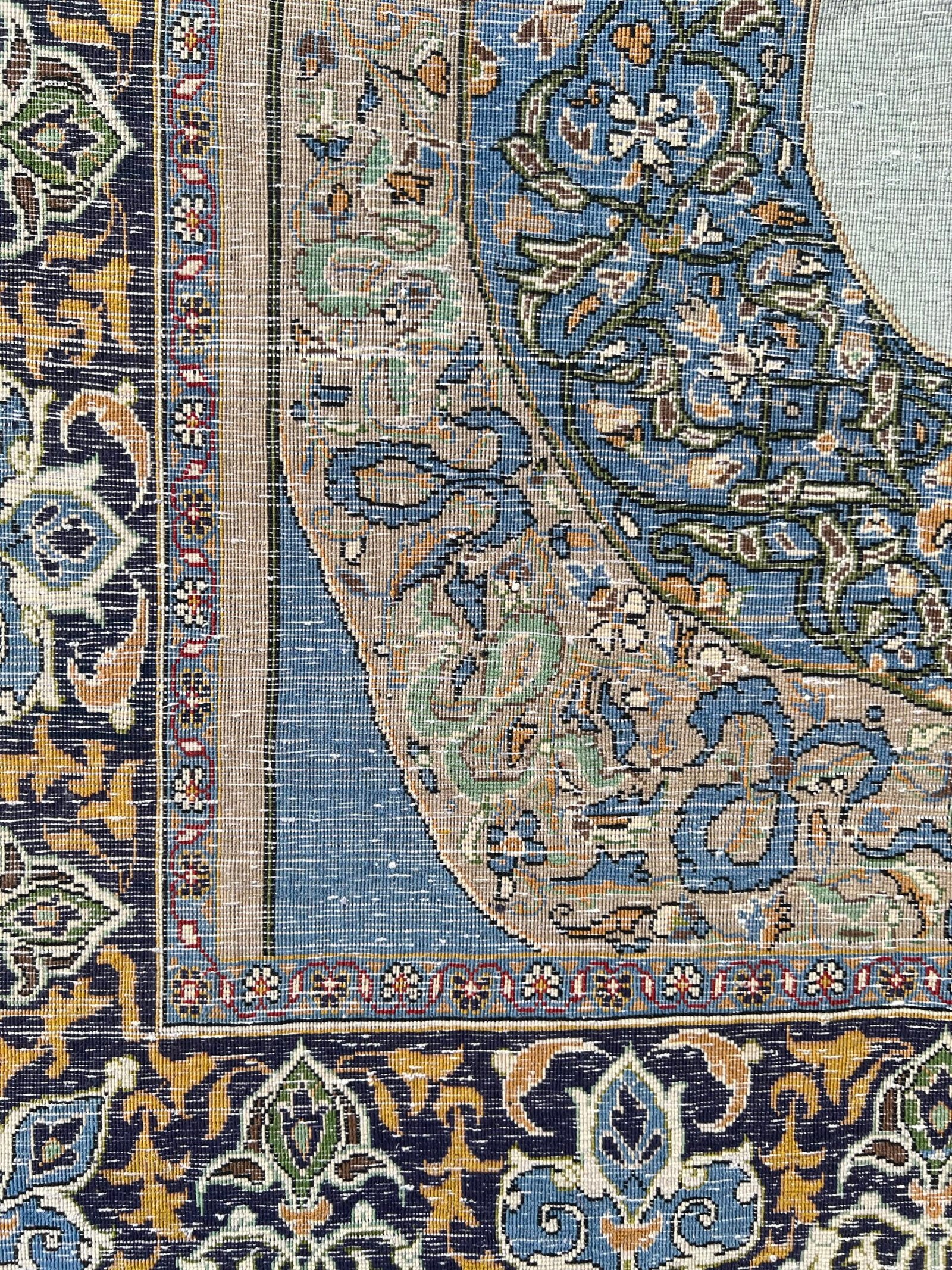 A majestic 1980s Kashan pictorial carpet woven with fine kork wool, portraying a royal court before the King of Kings. Every detail — from the flowing garments to the graceful faces — reflects the mastery of Kashan’s most skilled weavers.