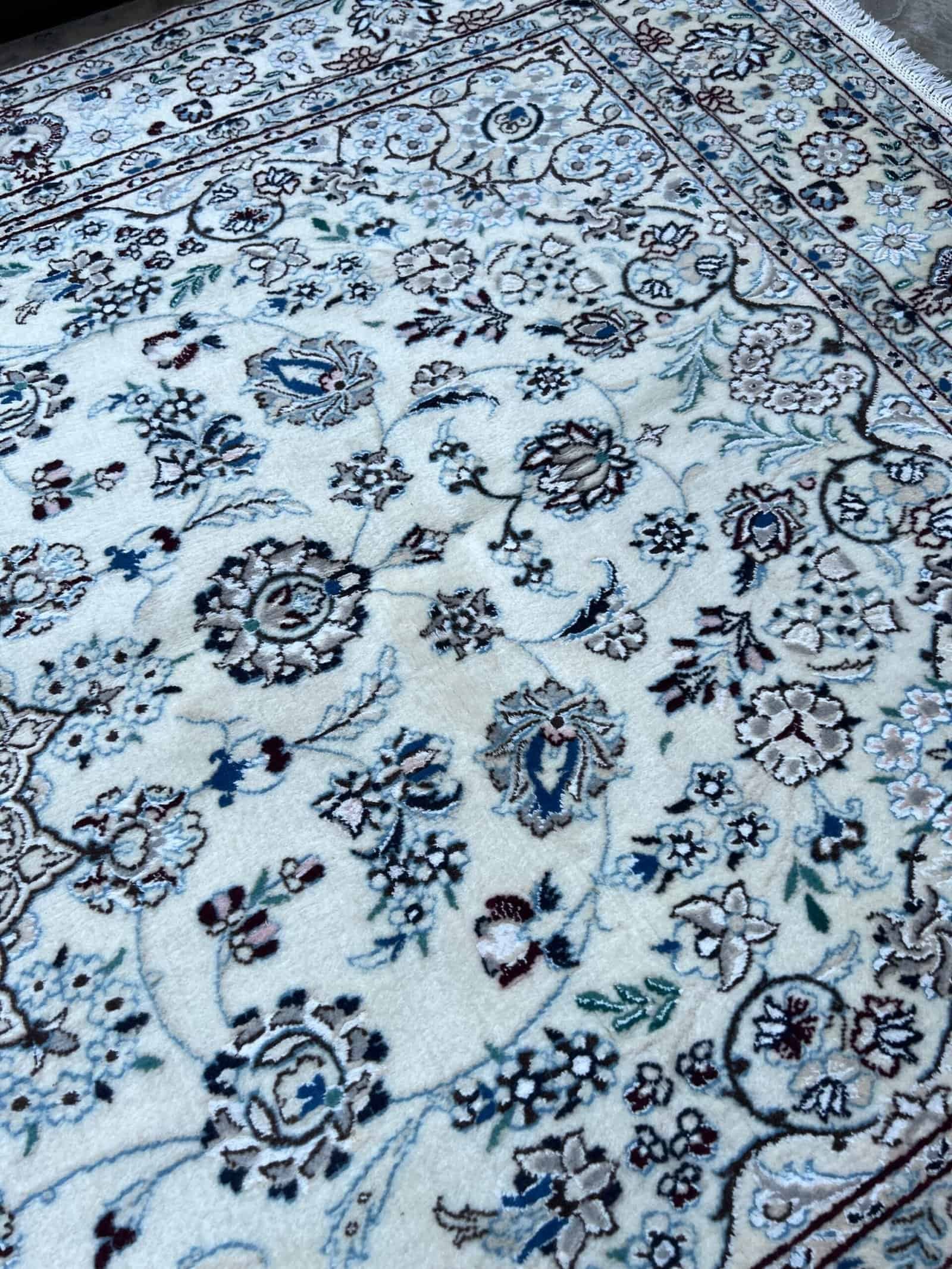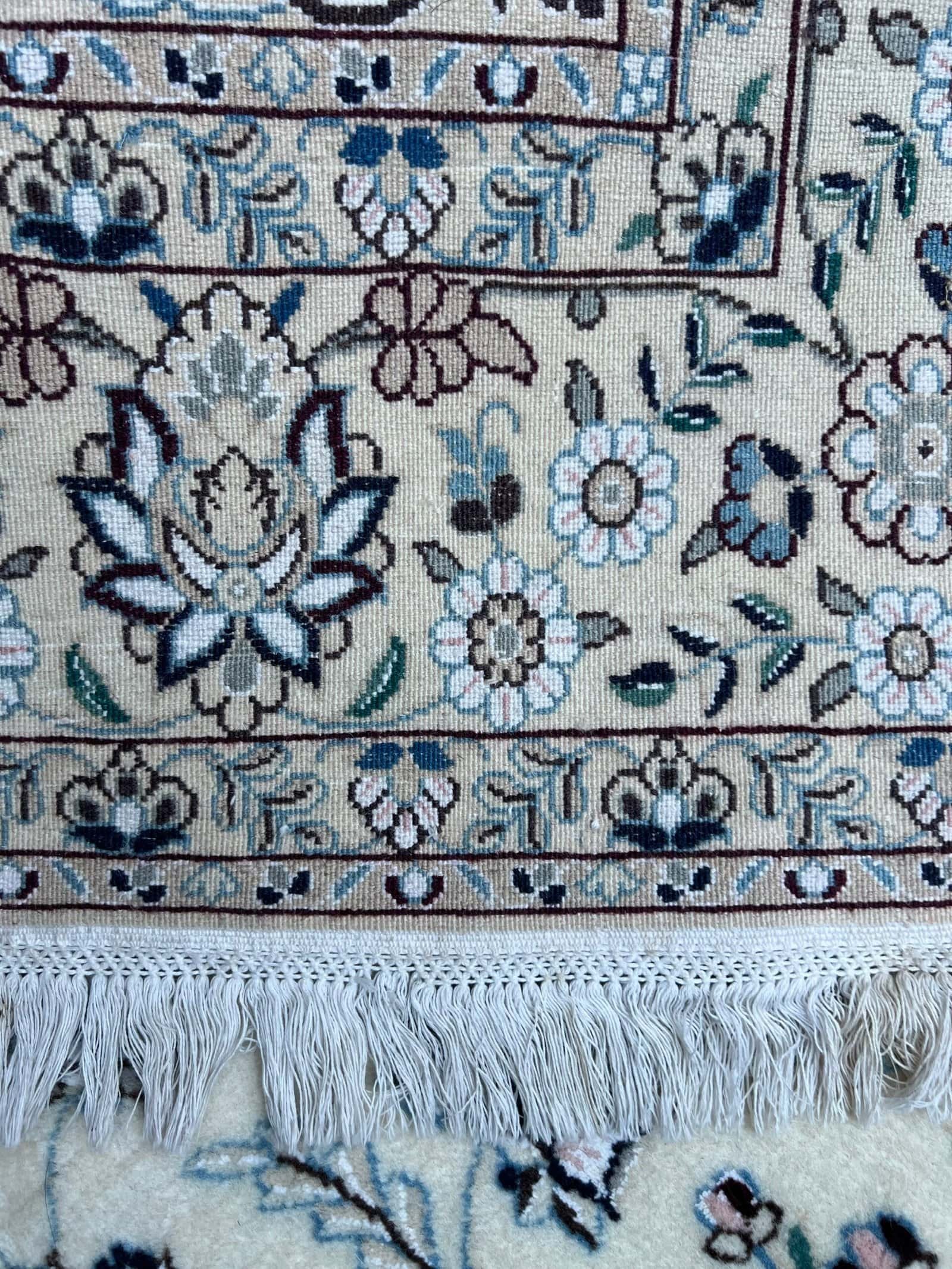 Finely hand-knotted with wool and silk on a cotton base, this classic Nain 9La features detailed floral patterns and a medallion design. Its soft colors and refined weave make it perfect for elegant interiors.