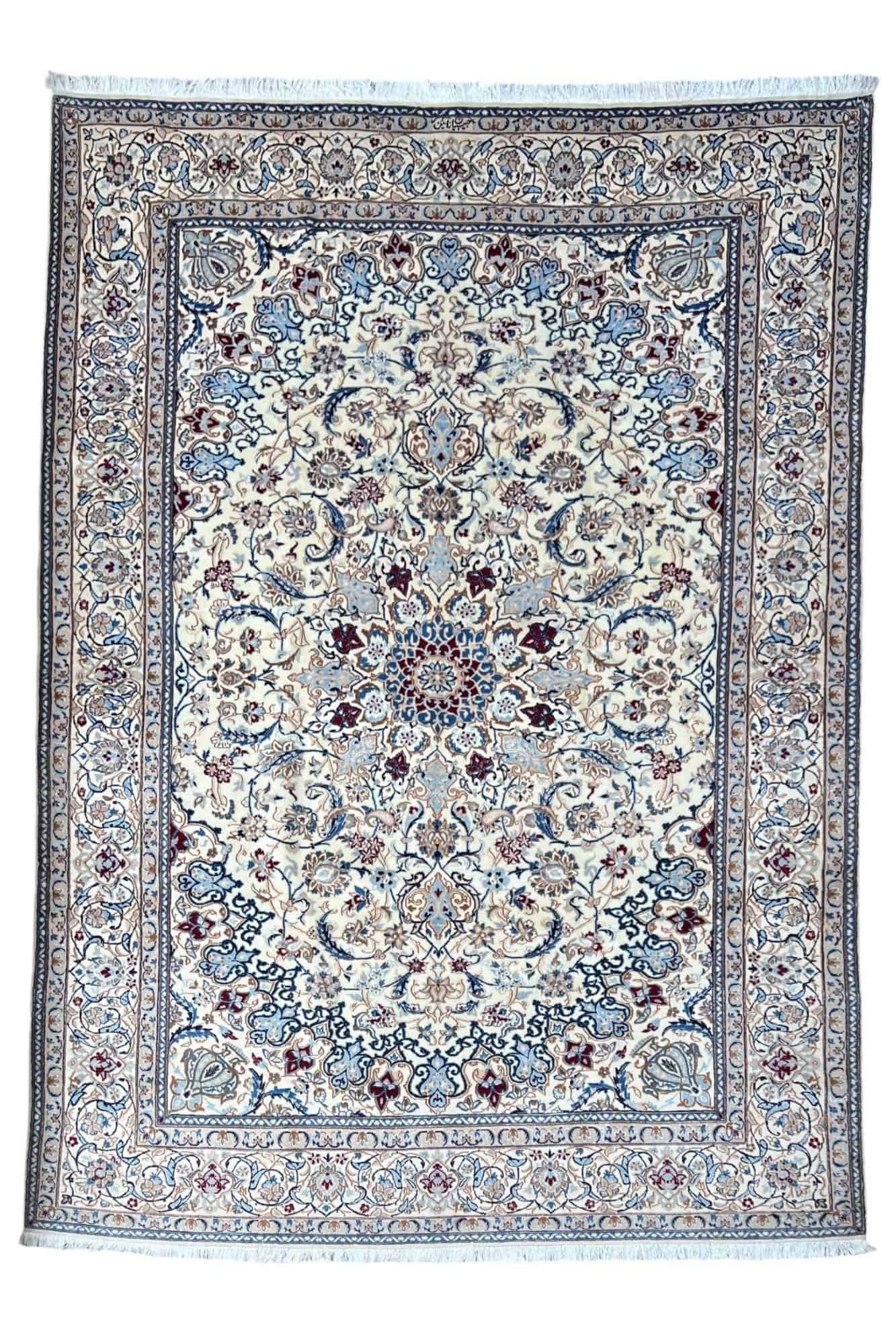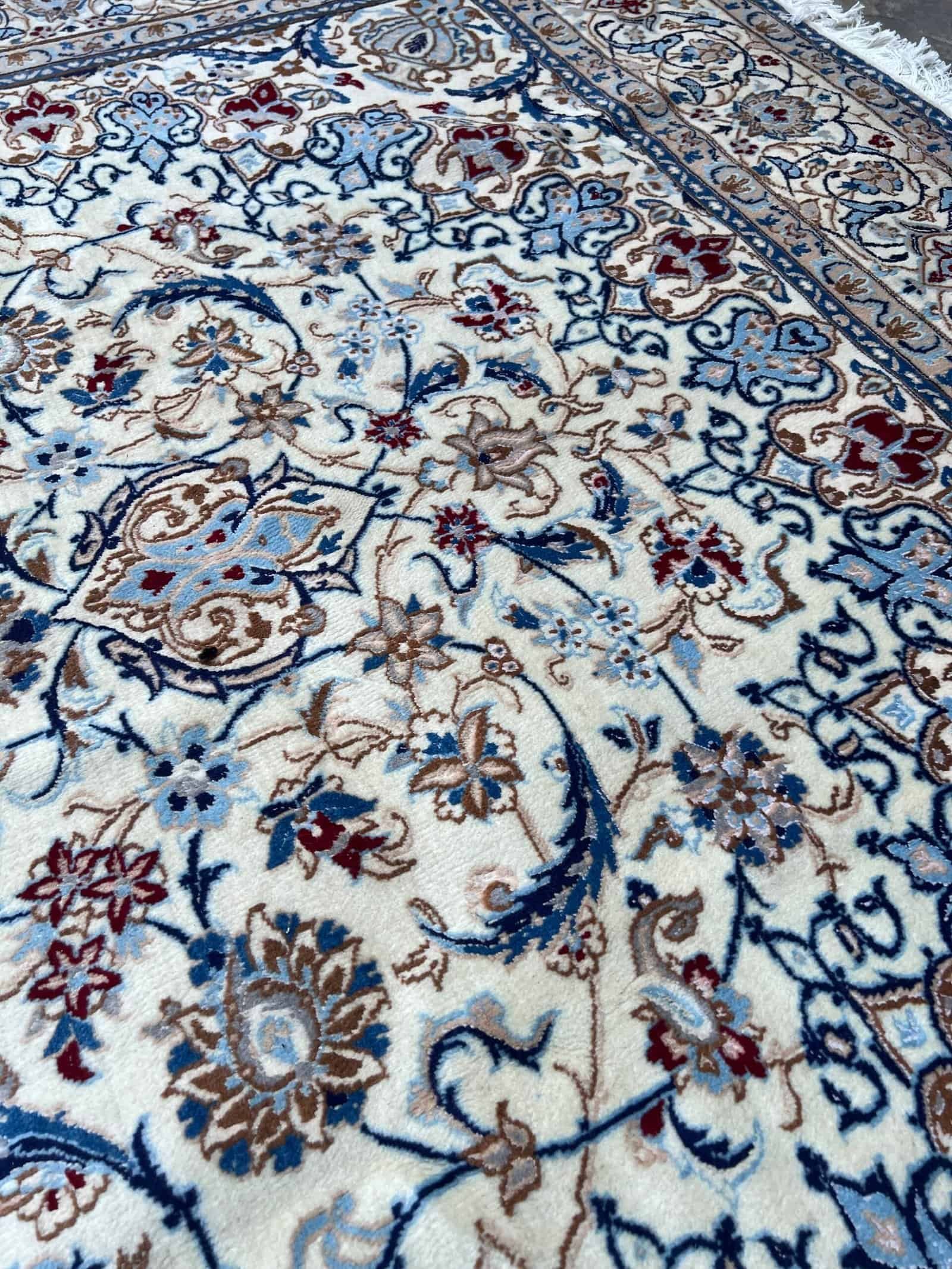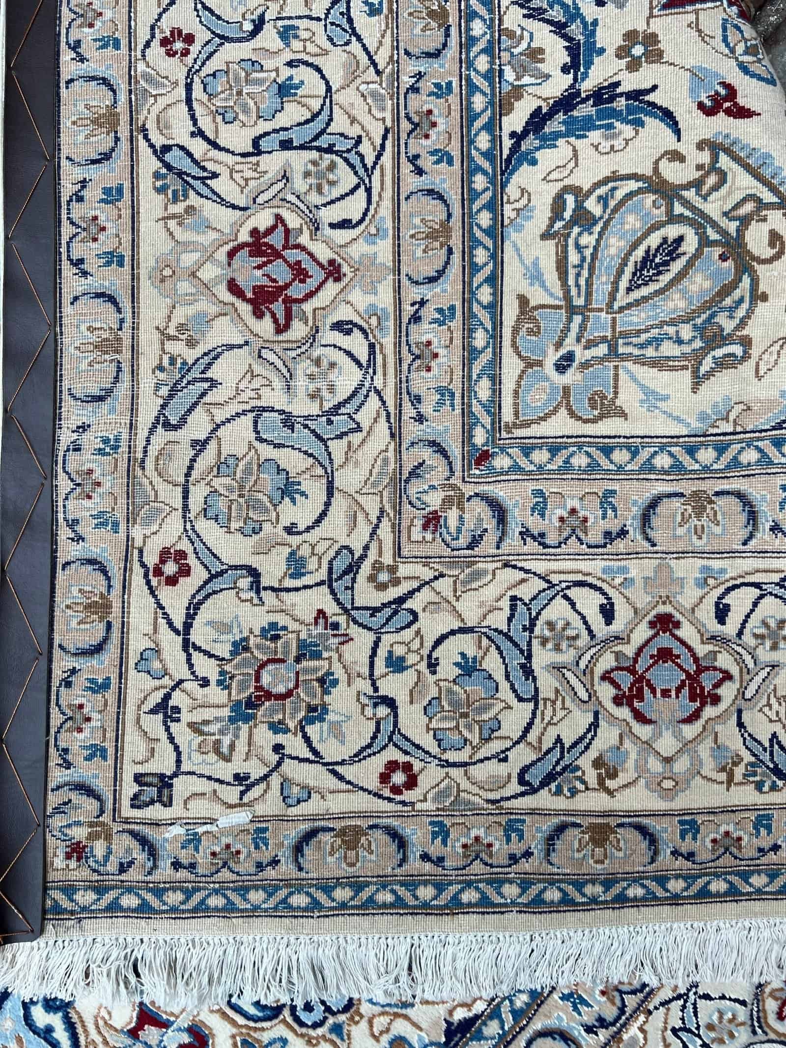 A fine Nain 9La rug from the 1990s, hand-knotted in Iran using soft wool and silk. Featuring classic floral motifs and a calm ivory-blue palette, it blends timeless elegance with fine craftsmanship — ideal for both traditional and modern spaces.