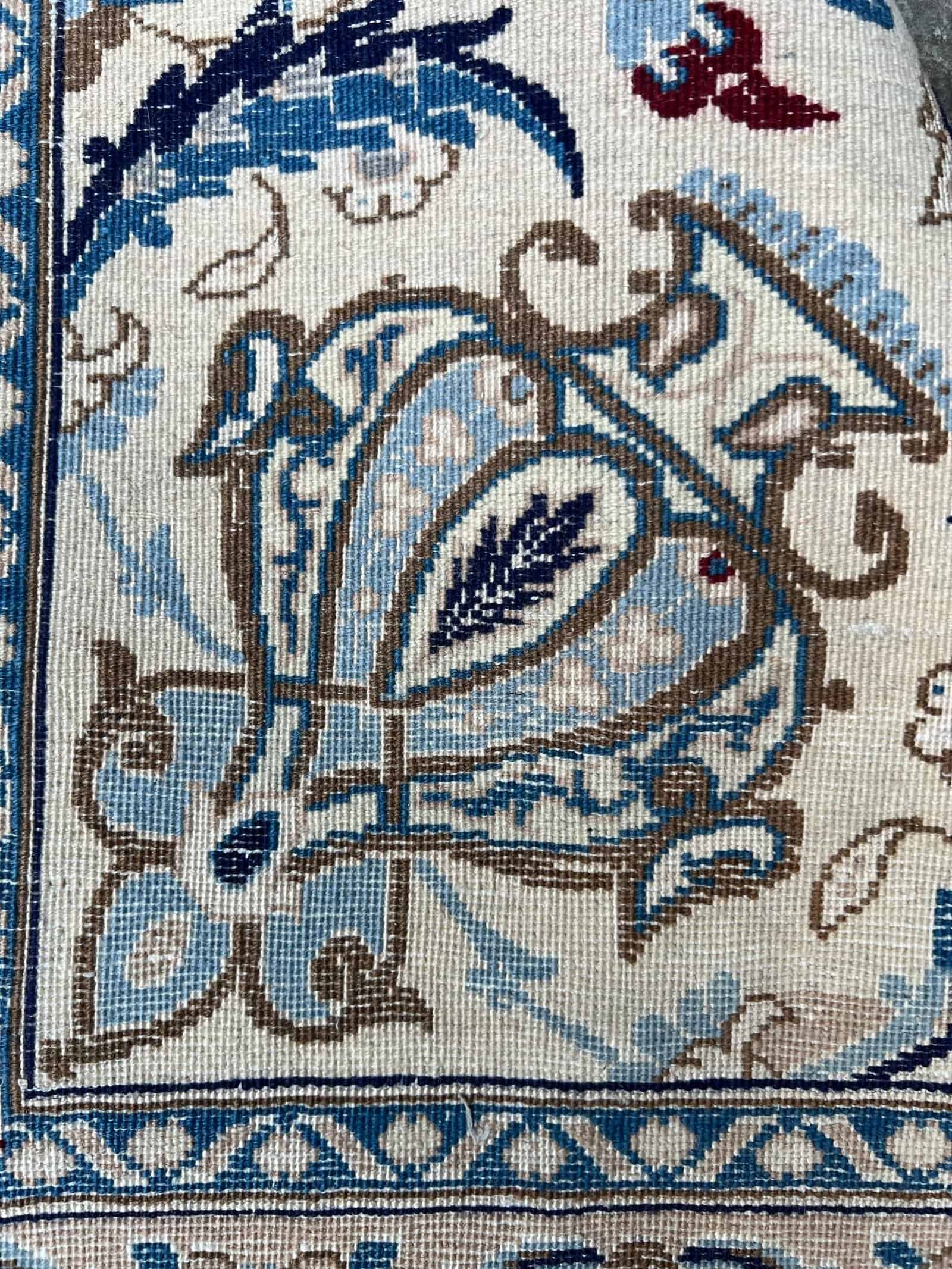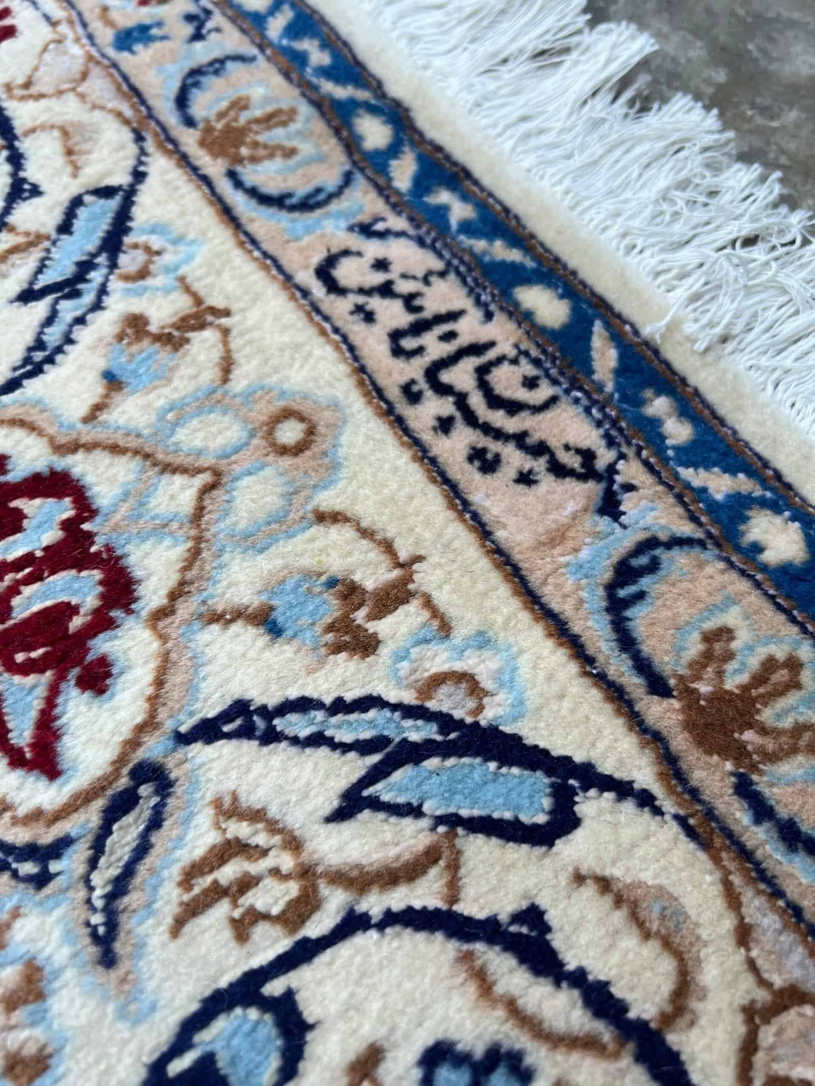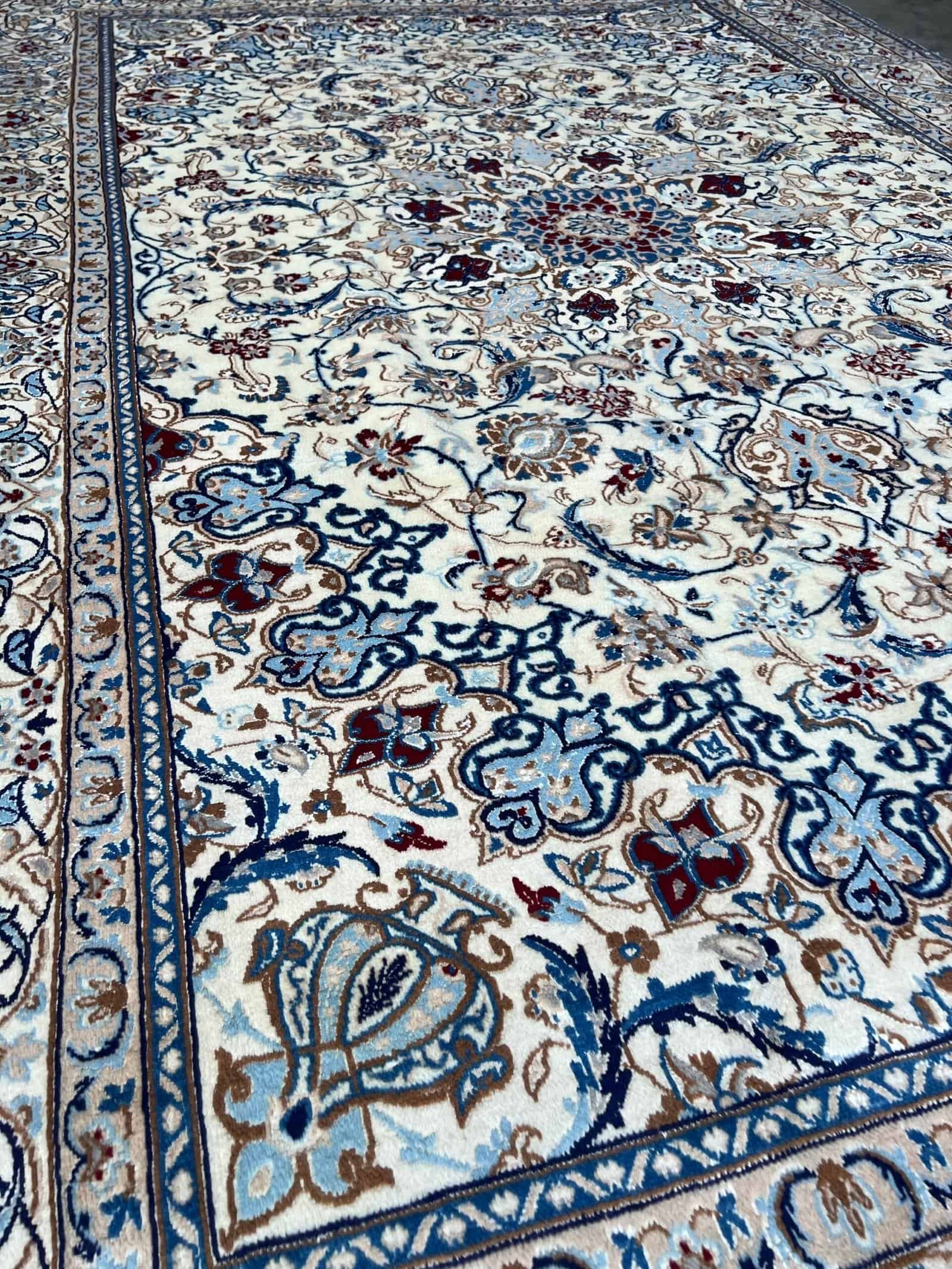 A fine Nain 9La rug from the 1990s, hand-knotted in Iran using soft wool and silk. Featuring classic floral motifs and a calm ivory-blue palette, it blends timeless elegance with fine craftsmanship — ideal for both traditional and modern spaces.