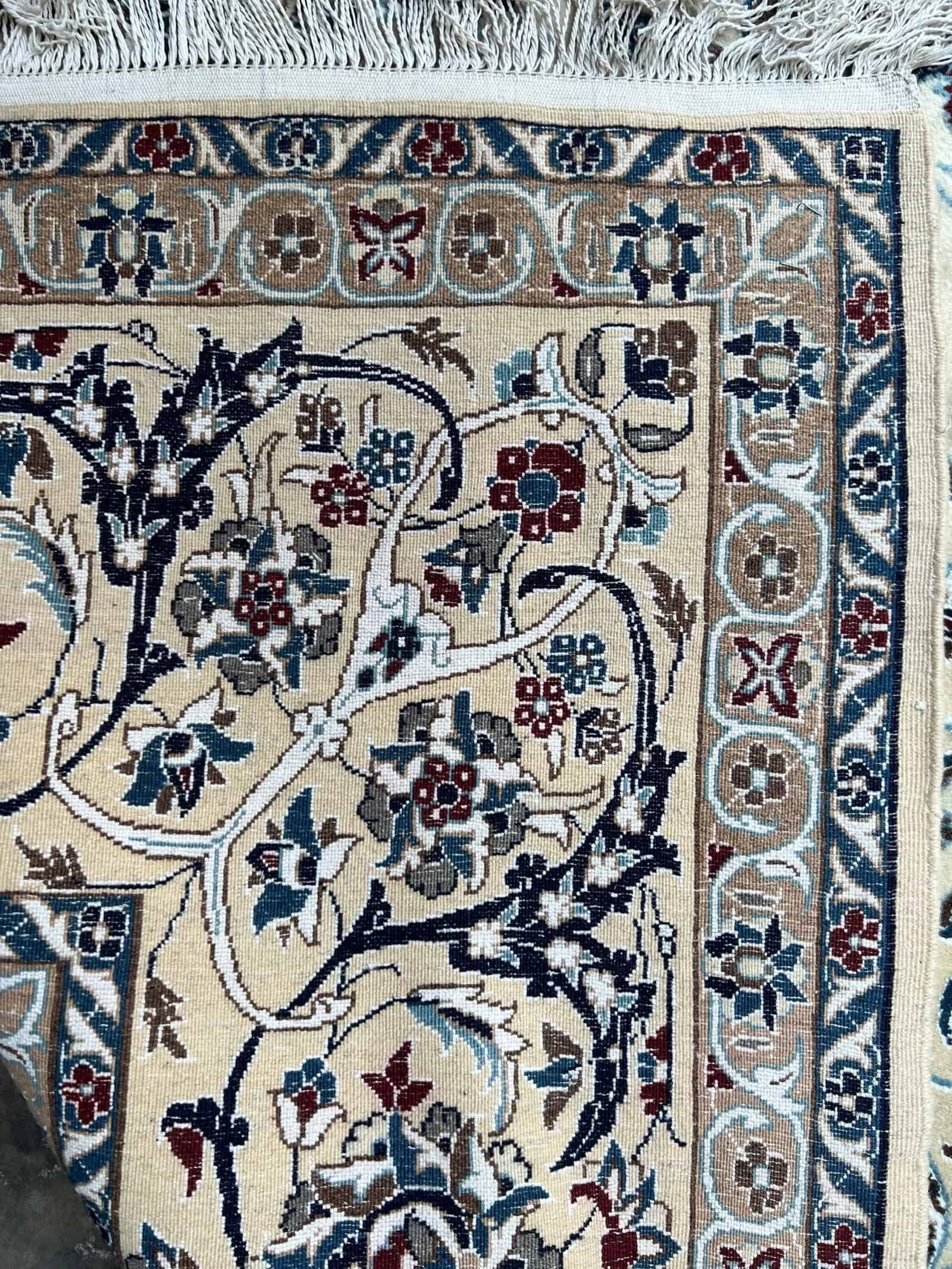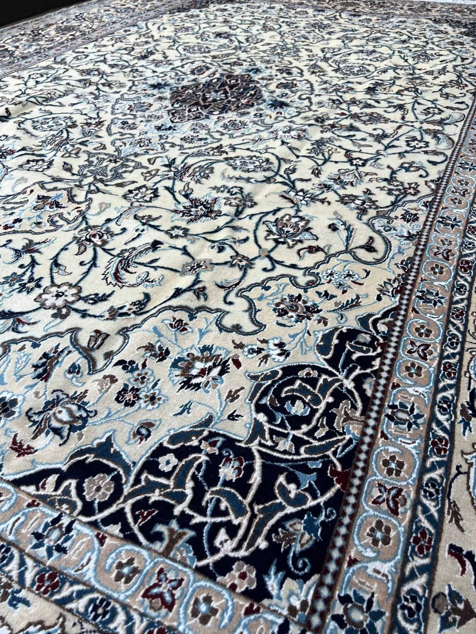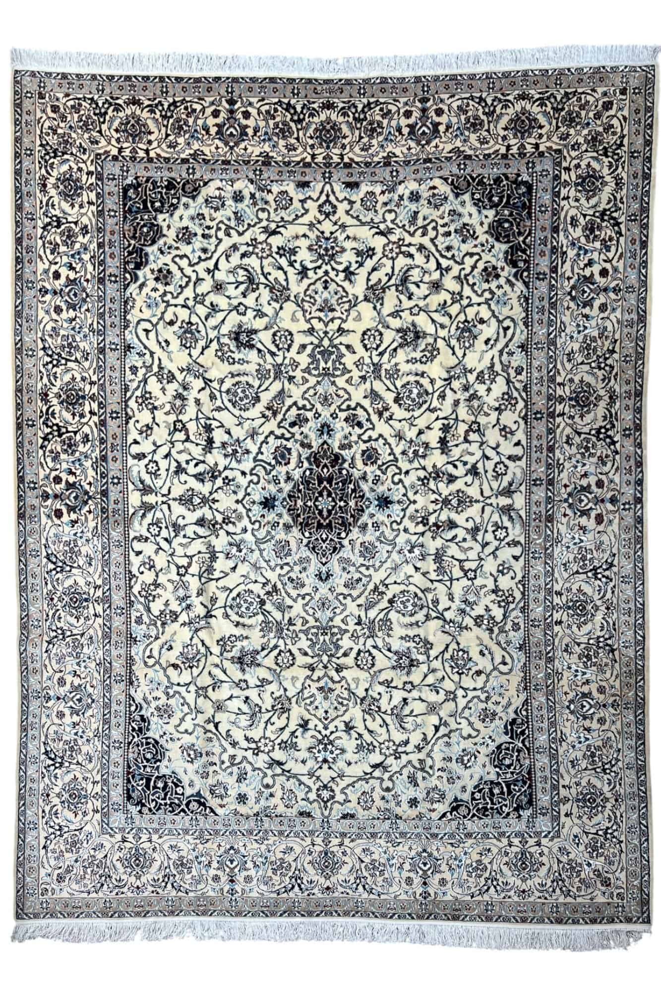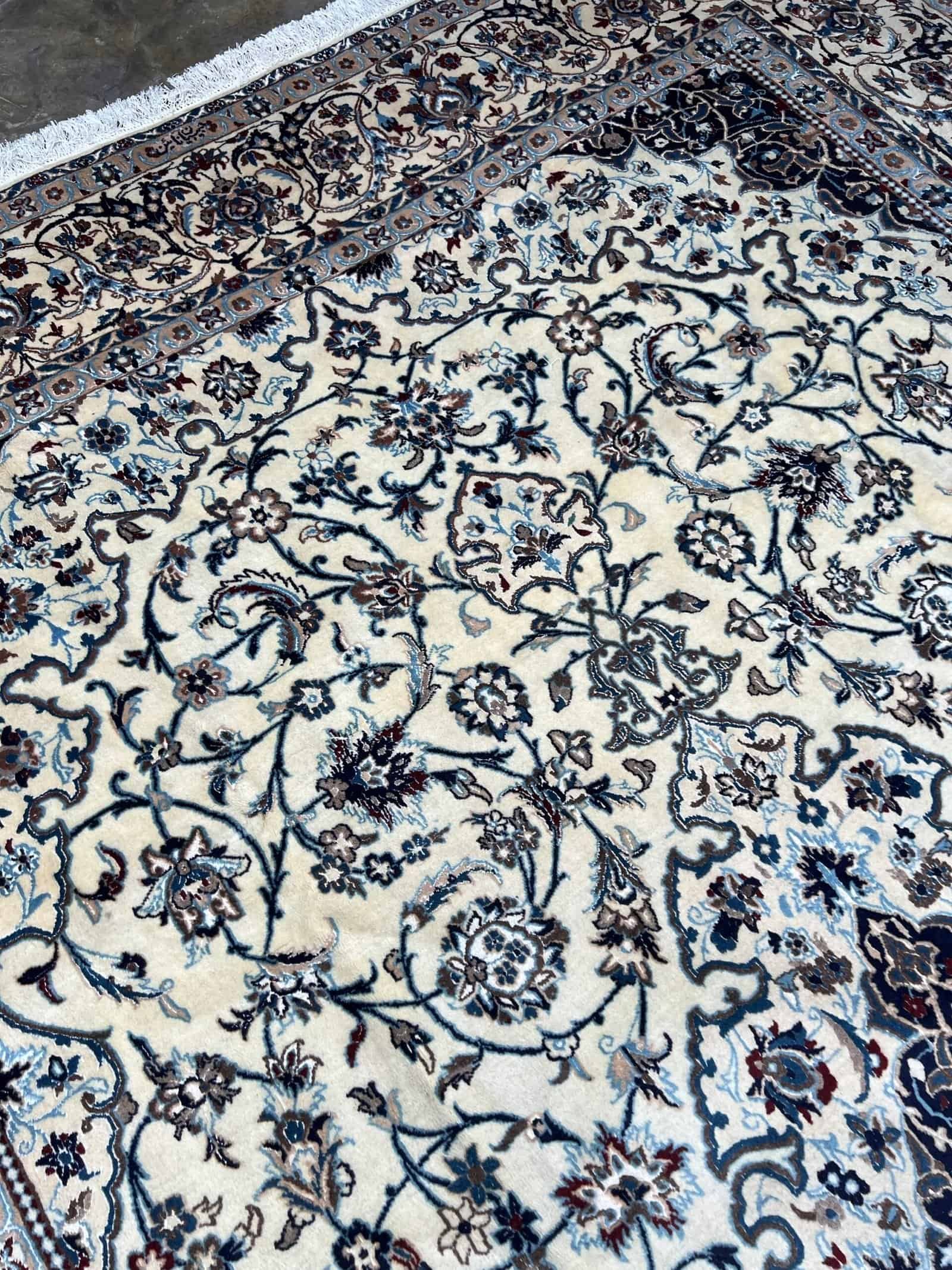 Nain 9La carpets are renowned for their balance of elegance, durability, and fine detailing. Woven in the city of Nain in central Iran, these rugs typically feature a blend of high-quality wool with silk inlay, enhancing the intricate floral and medallion motifs. The “9La” classification indicates a finer weave and higher knot count, making it an excellent choice for those seeking a refined and sophisticated Persian rug that still offers everyday durability.