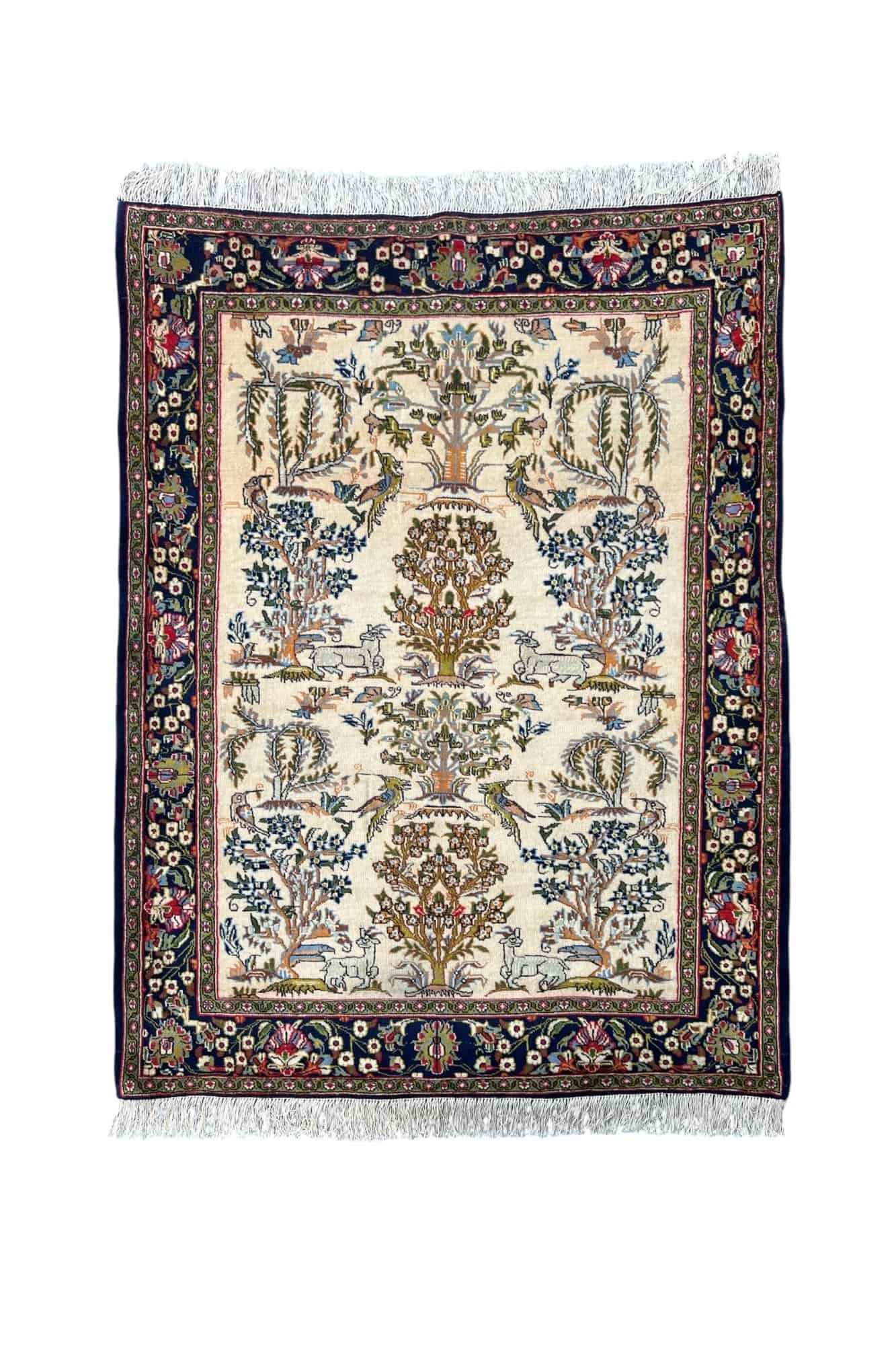 A finely handwoven Qom rug from the 1970s, featuring an elegant garden design. Crafted with wool on a cotton foundation, it reflects the artistry and refinement Qom rugs are known for. A timeless collectible that blends tradition with lasting beauty.