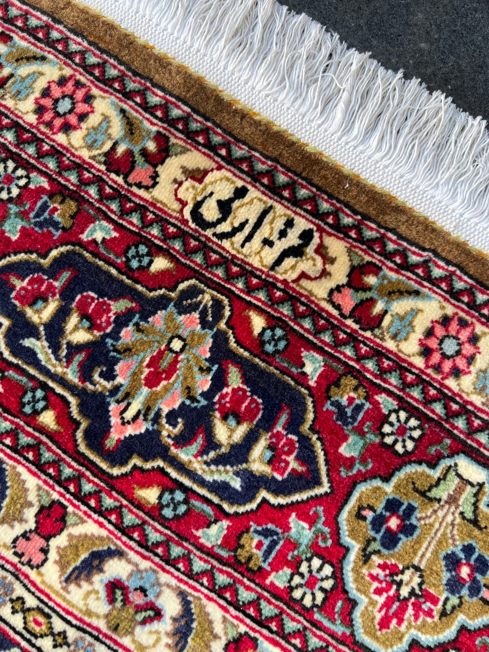 A beautiful Qom piece woven in fine kork wool, carrying the classic kheshti layout with a detailed hunting scene in the center. The corners include elegant koffe writing, and the signature “Irami” is clearly visible on the border. The colors, the balance, and the softness all come together in a very refined way. A real collectible Qom with character, perfect for adding warmth and personality to any room.