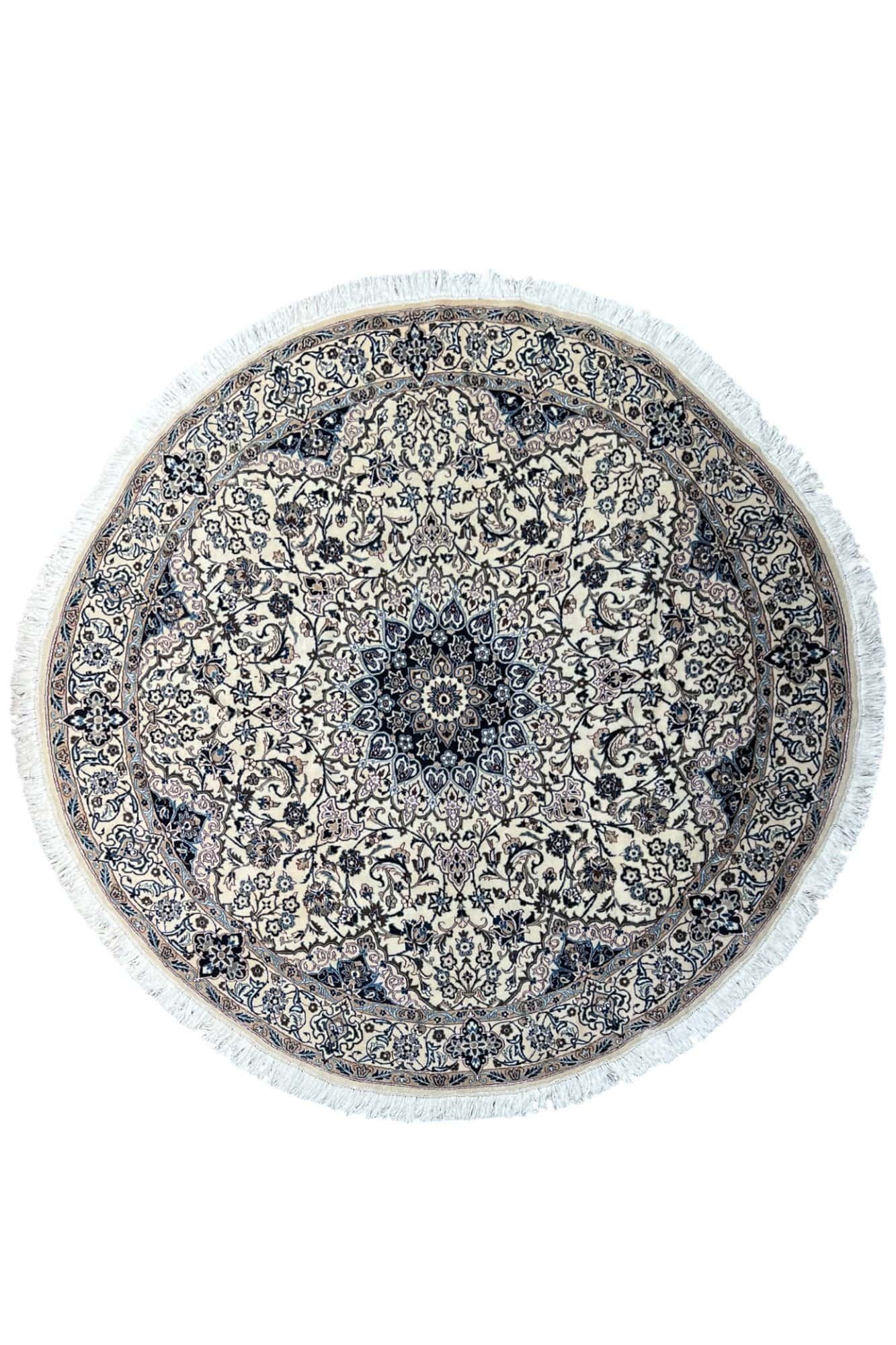 A beautifully handwoven round Nain carpet featuring fine silk and wool detailing. With its classic medallion design and soft neutral tones, this piece blends traditional elegance with timeless harmony—perfect for adding a refined touch to any space.