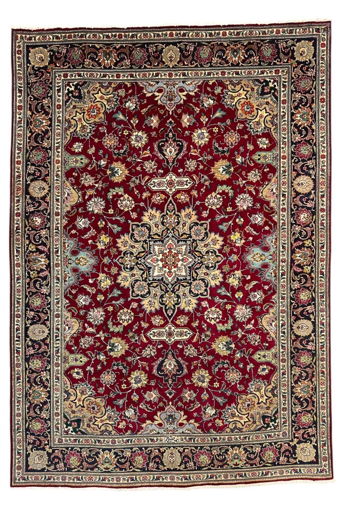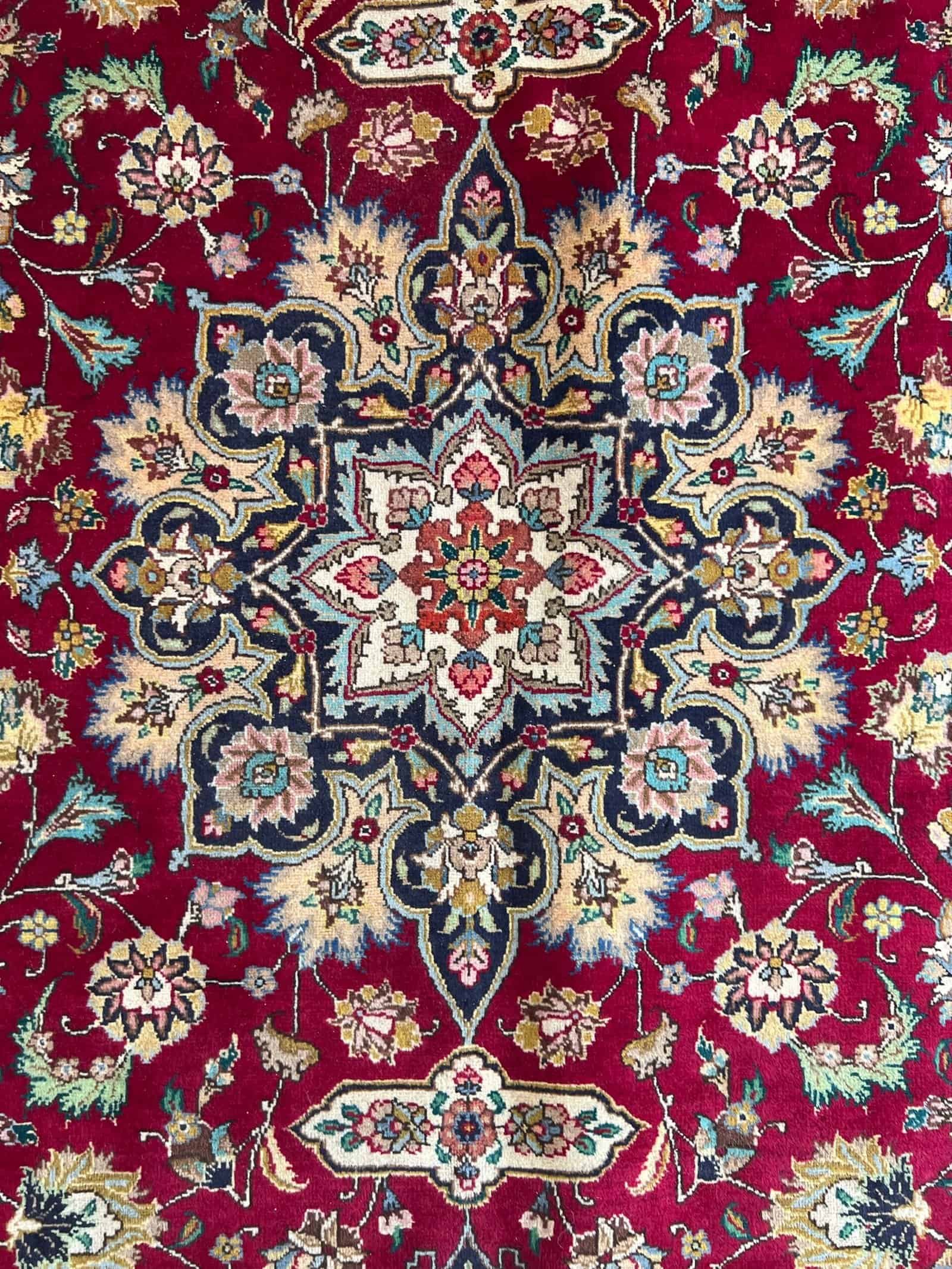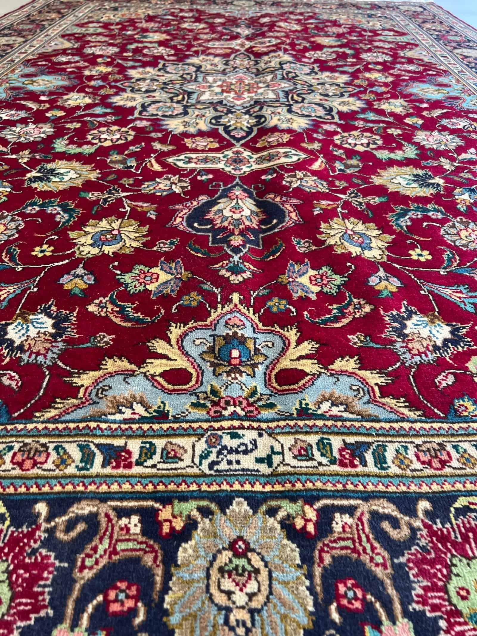 This elegant Tabriz rug, signed and woven in the 1980s, is a classic representation of the city’s rich weaving tradition. Featuring a central medallion design surrounded by floral and arabesque patterns, it reflects the precision and harmony Tabriz is known for. The craftsmanship is detailed and balanced, with a fine wool pile and subtle color gradients. A timeless piece that brings heritage and artistry to any interior.
