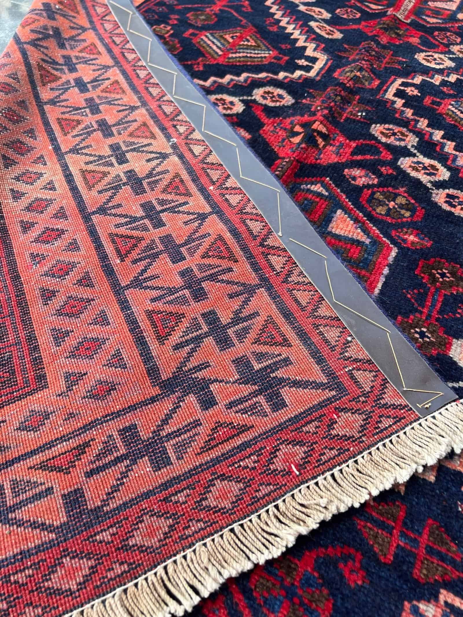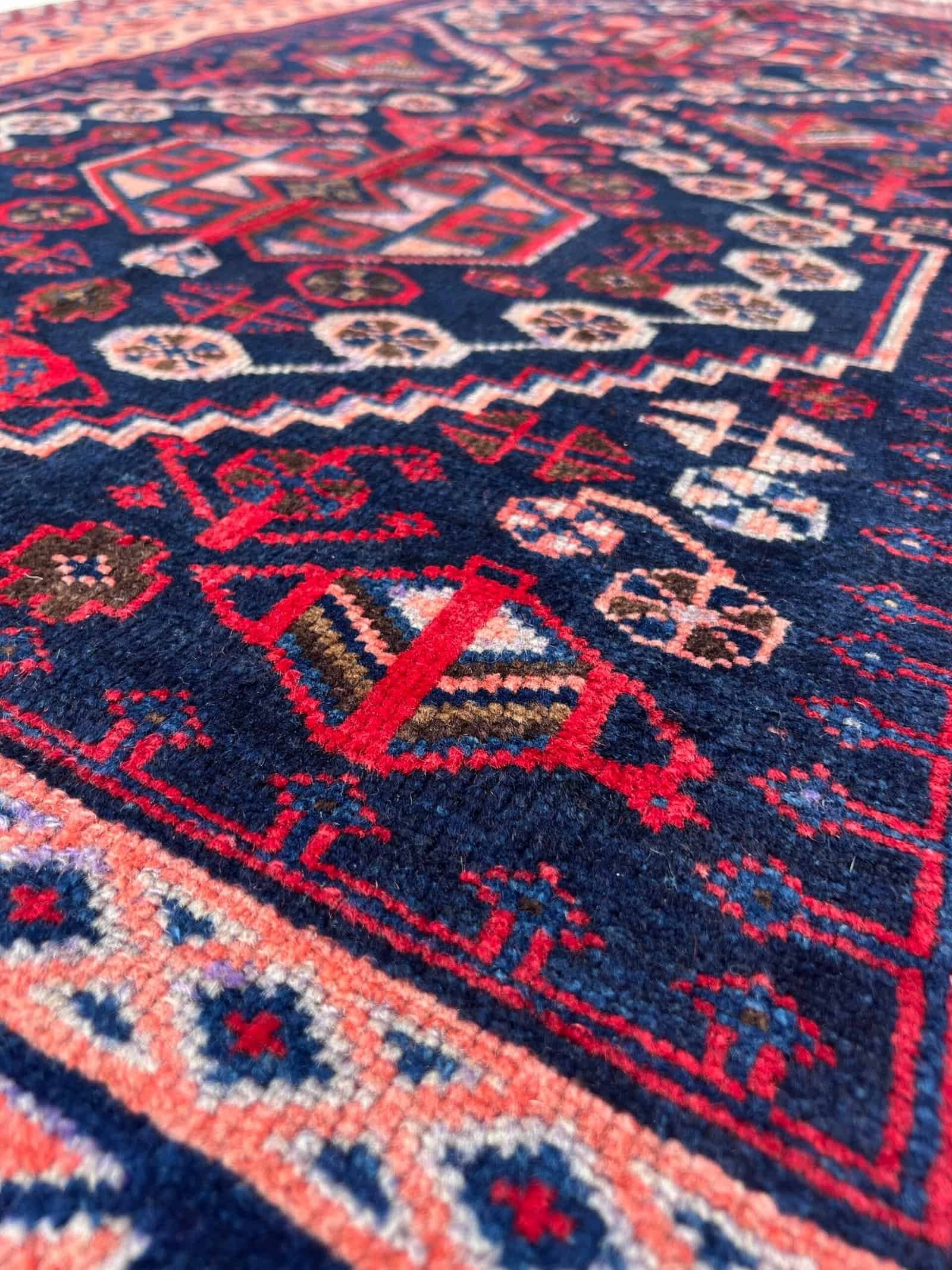 This Blue Hamadan rug, handwoven in the 1980s, showcases the rich tones and bold geometry typical of the Hamadan region in Iran. Its deep indigo-blue field, accented with tribal motifs, reflects a timeless village aesthetic. Durable and full of charm, it’s perfect as a vintage accent piece for both classic and modern interiors.