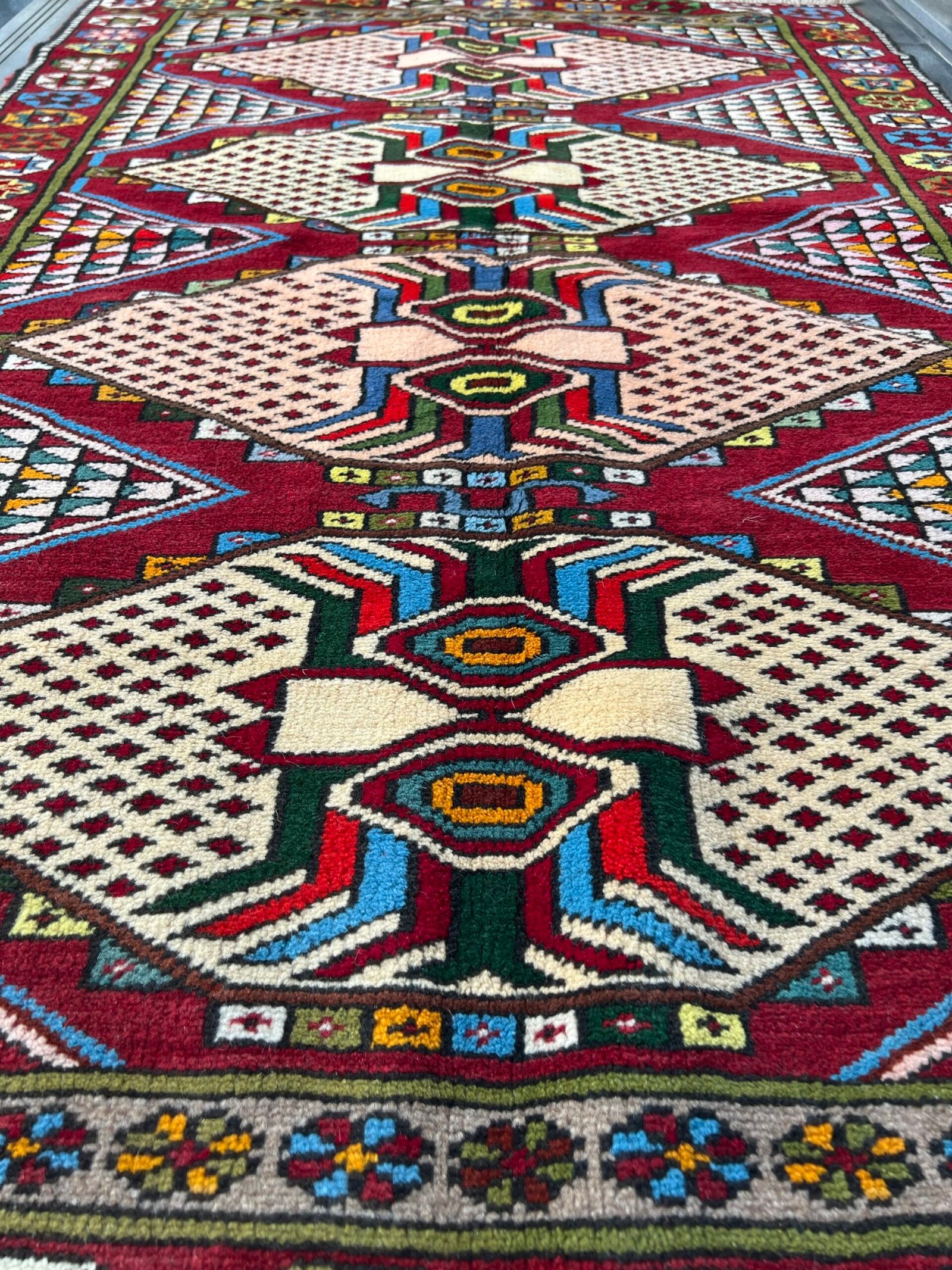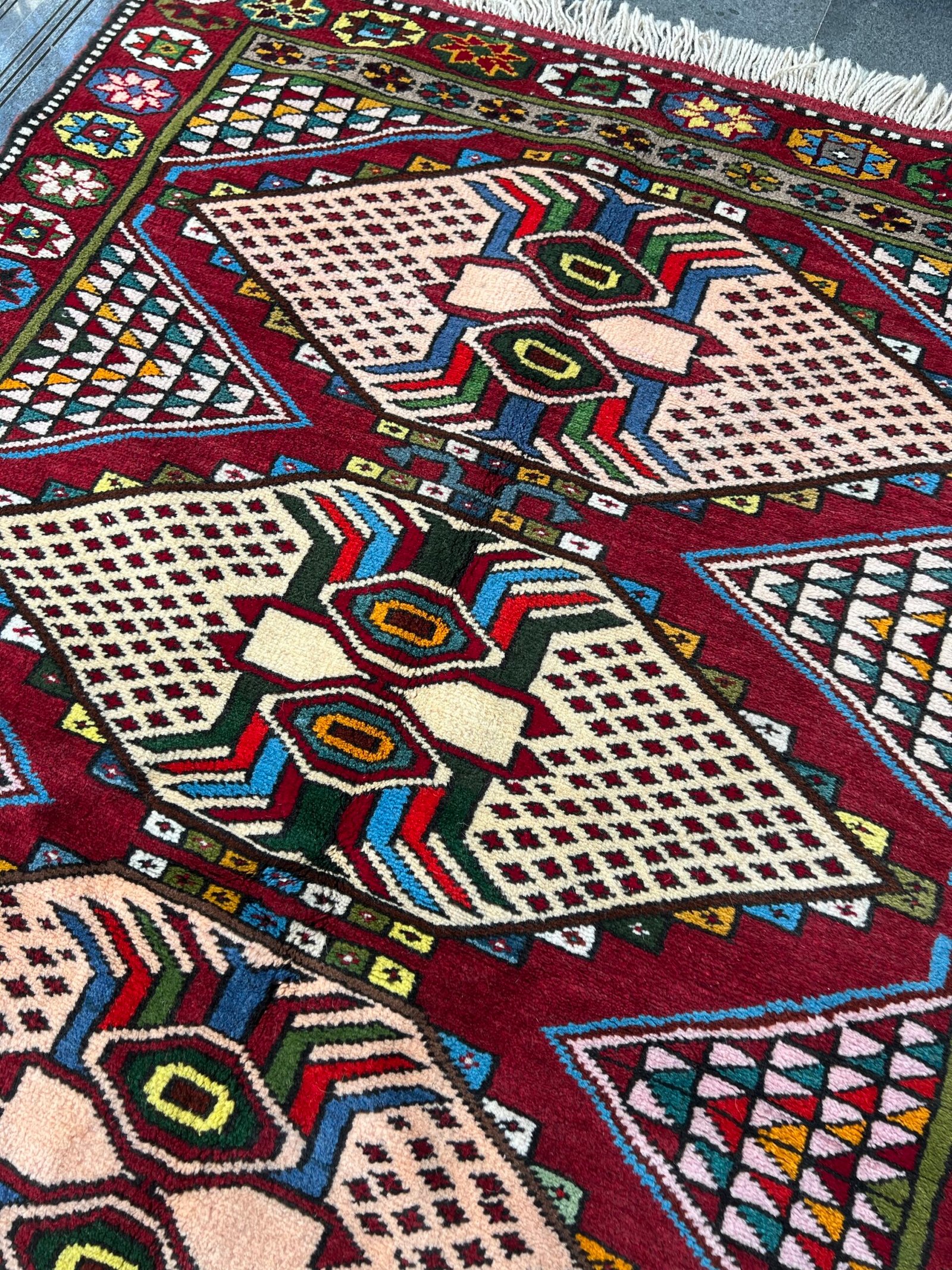 Handmade tribal Quchan rug with vibrant colors and bold geometric patterns. Durable, soft, and full of character—perfect for adding warmth and style to any room.